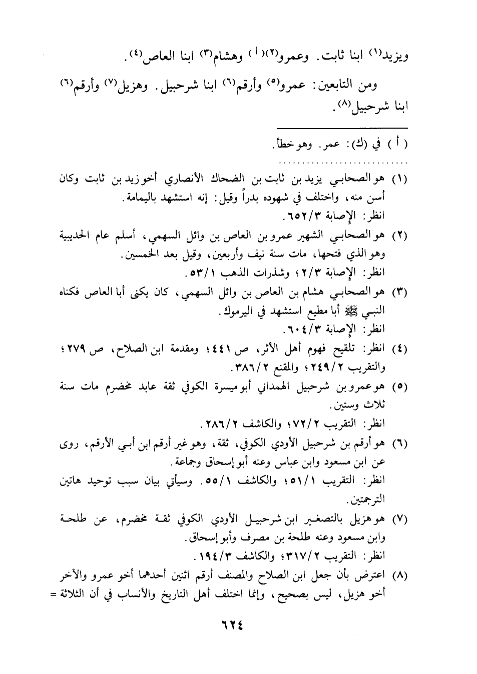 (¬8) اعترض بأن جعل ابن الصلاح والمصنف أرقم اثنين أحدهما أخو عمرو والآخر أخو هزيل، ليس بصحيح، وإنما اختلف أهل التاريخ والأنساب في أن الثلاثة =