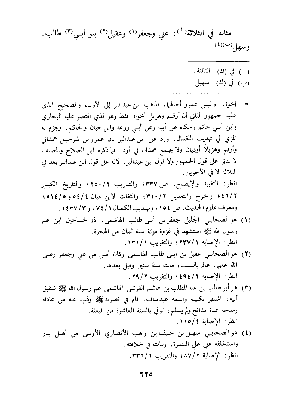 مثاله في الثلاثة (أ): علي وجعفر (¬1) وعقيل (¬2) بنو أبي (¬3) طالب. وسهل (ب) (¬4)