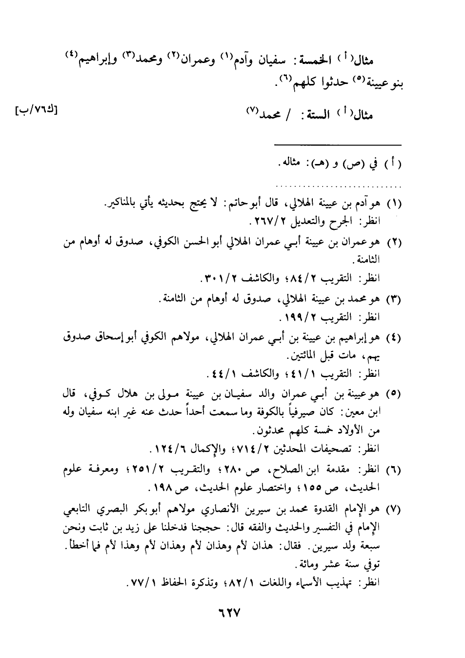 مثال (أ) الخمسة: سفيان وآدم (¬1) وعمران (¬2) ومحمد (¬3) وإبراهيم (¬4) بنو عيينة (¬5) حدثوا كلهم (¬6).