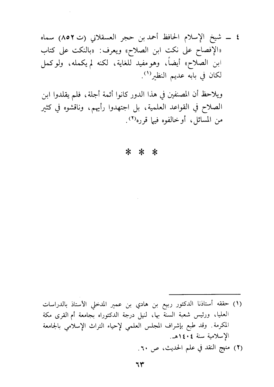 4 - شيخ الإِسلام الحافظ أحمد بن حجر العسقلاني (ت 852) سماه "الإِفصاح على نكت ابن الصلاح" ويعرف: "بالنكت على كتاب ابن الصلاح" أيضًا، وهو مفيد للغاية، لكنه لم يكمله، ولو كمل لكان في بابه عديم النظير (¬1).
