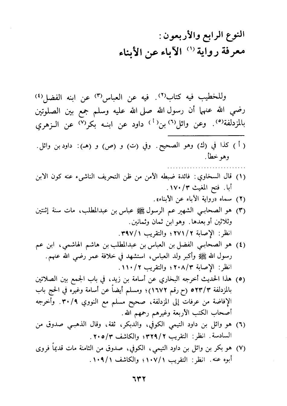 وللخطيب فيه كتاب (¬2). فيه عن العباس (¬3) عن ابنه الفضل (¬4) رضي الله عنهما أن رسول الله صلى الله عليه وسلم جمع بين الصلوتين بالمزدلفة (¬5). وعن وائل (¬6) بن (أ) داود عن ابنه بكر (¬7) عن الزهري