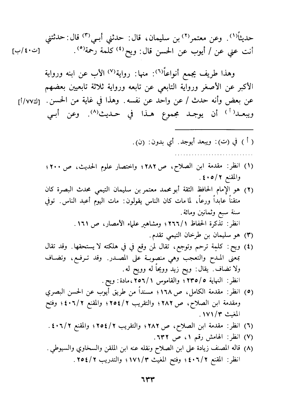 (¬5) انظر: مقدمة الكامل، ص 168؛ مسندًا من طريق أيوب عن الحسن البصري ومقدمة ابن الصلاح، ص 282؛ والتقريب 2/ 254؛ والمقنع 2/ 406؛ وفتح المغيث 3/ 171.
