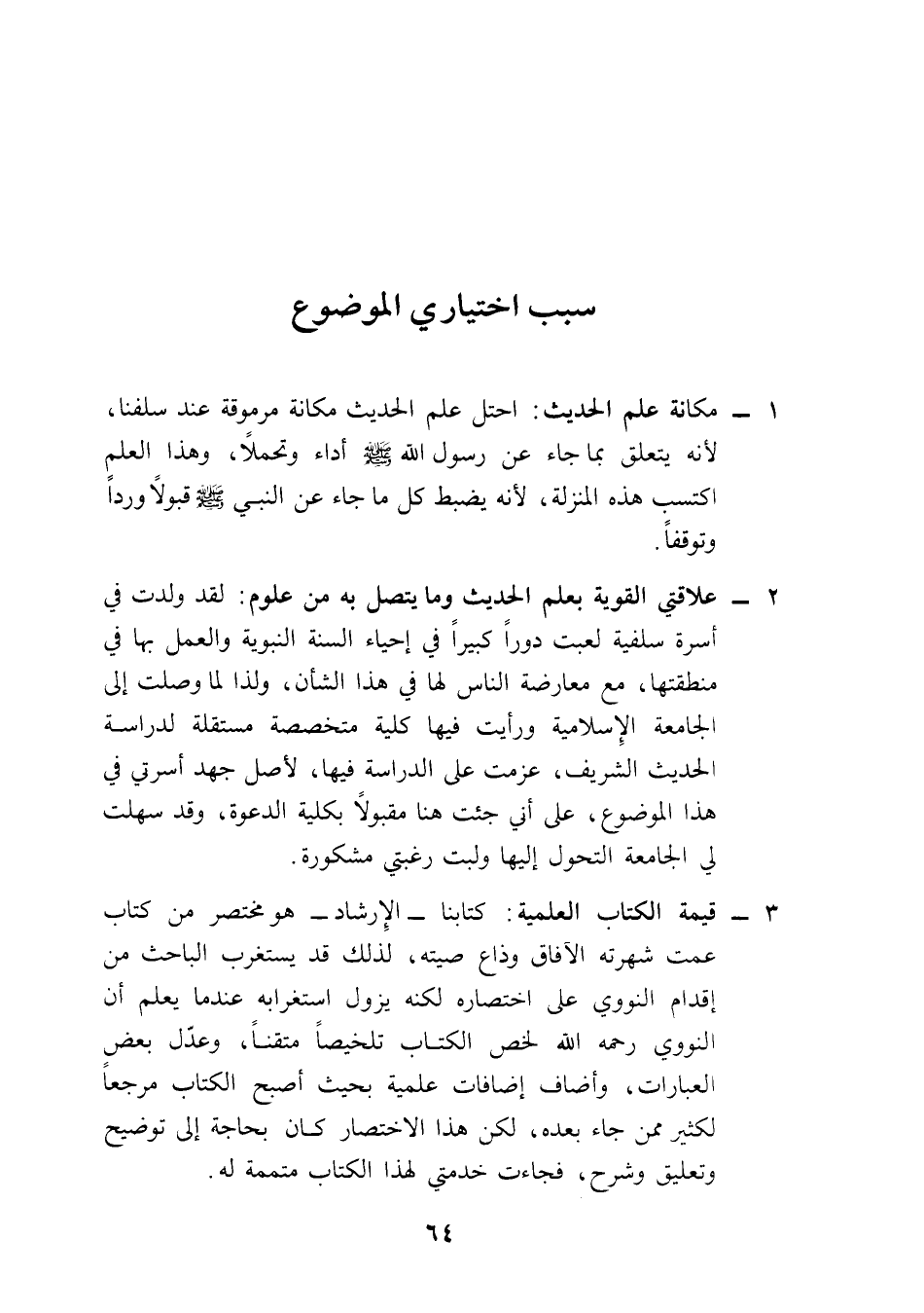 3 - قيمة الكتاب العلمية: كتابنا - الإِرشاد - هو مختصر من كتاب عمت شهرته الآفاق وذاع صيته، لذلك قد يستغرب الباحث من إقدام النووي على اختصاره لكنه يزول استغرابه عندما يعلم أن النووي رحمه الله لخص الكتاب تلخيصًا متقنًا، وعدّل بعض العبارات، وأضاف إضافات علمية بحيث أصبح الكتاب مرجعًا لكثير ممن جاء بعده، لكن هذا الاختصار كان بحاجة إلى توضيح وتعليق وشرح، فجاءت خدمتي لهذا الكتاب متممة له.