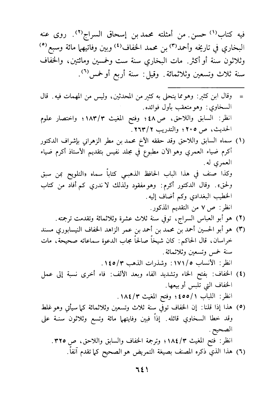 فيه كتاب (¬1) حسن. من أمثلته محمد بن إسحاق السراج (¬2). روى عنه البخاري في تاريخه وأحمد (¬3) بن محمد الخفاف (¬4) وبين وفاتيهما مائة وسبع (¬5) وثلاثون سنة أو أكثر. مات البخاري سنة ست وخمسين ومائتين، والخفاف سنة ثلاث وتسعين وثلاثمائة. وقيل: سنة أربع أو خمس (¬6).