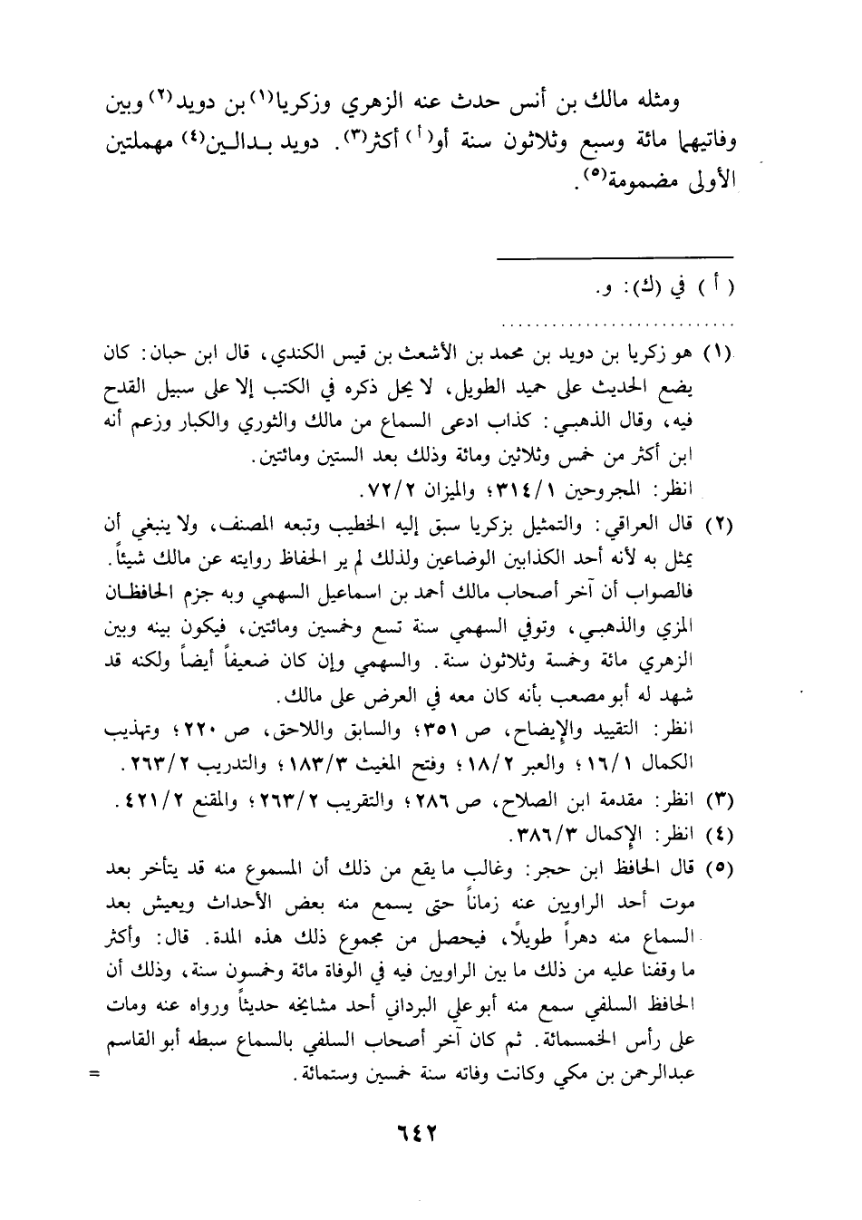 ومثله مالك بن أنس حدث عنه الزهري وزكريا (¬1) بن دويد (¬2) وبين وفاتيهما مائة وسبع وثلاثون سنة أو (أ) أكثر (¬3). دويد بدالين (¬4) مهملتين الأولى مضمومة (¬5).