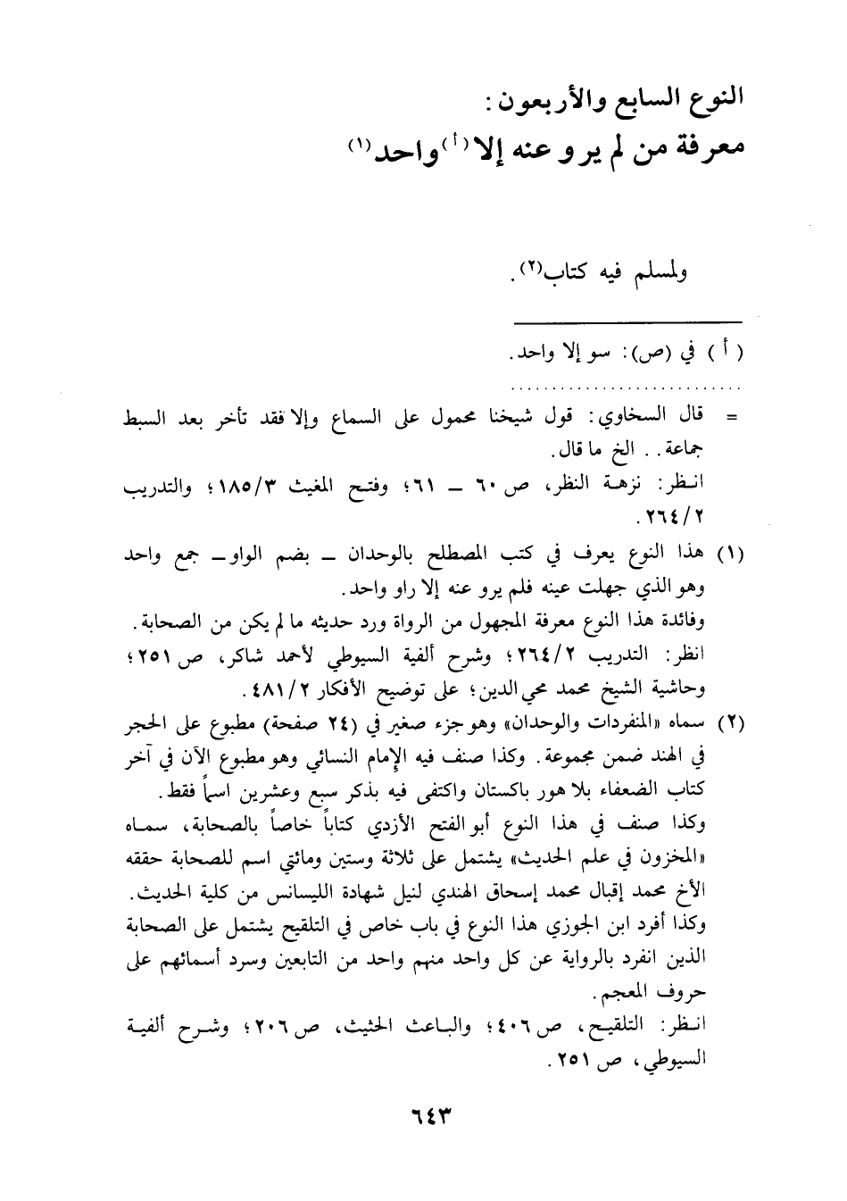 (¬1) هذا النوع يعرف في كتب المصطلح بالوحدان - بضم الواو - جمع واحد وهو الذي جهلت عينه فلم يرو عنه إلا راو واحد.