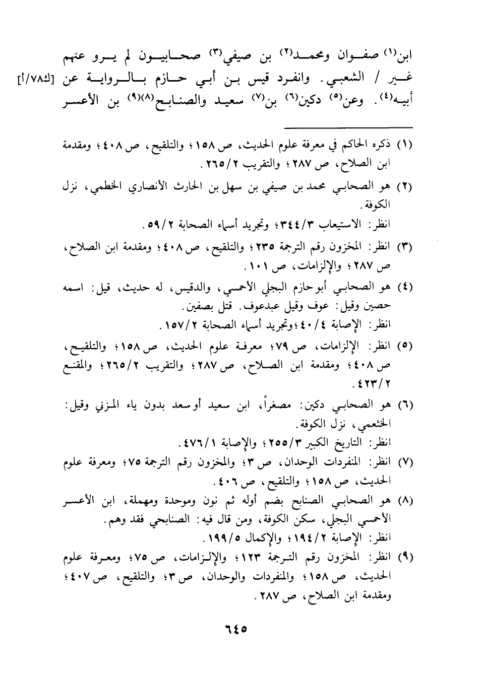 (¬5) انظر: الإِلزامات، ص 79؛ معرفة علوم الحديث، ص 158؛ والتلقيح، ص 408؛ ومقدمة ابن الصلاح، ص 287؛ والتقريب 2/ 265؛ والمقنع 2/ 423.