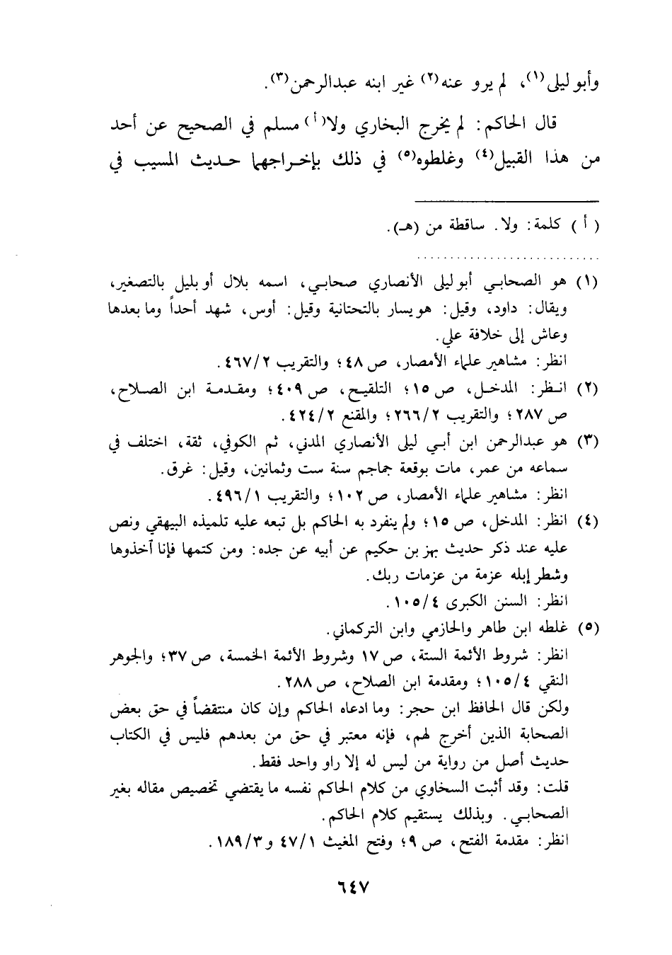 قال الحاكم: لم يخرج البخاري ولا (أ) مسلم في الصحيح عن أحد من هذا القبيل (¬4) وغلطوه (¬5) في ذلك بإخراجهما حديث المسيب في
