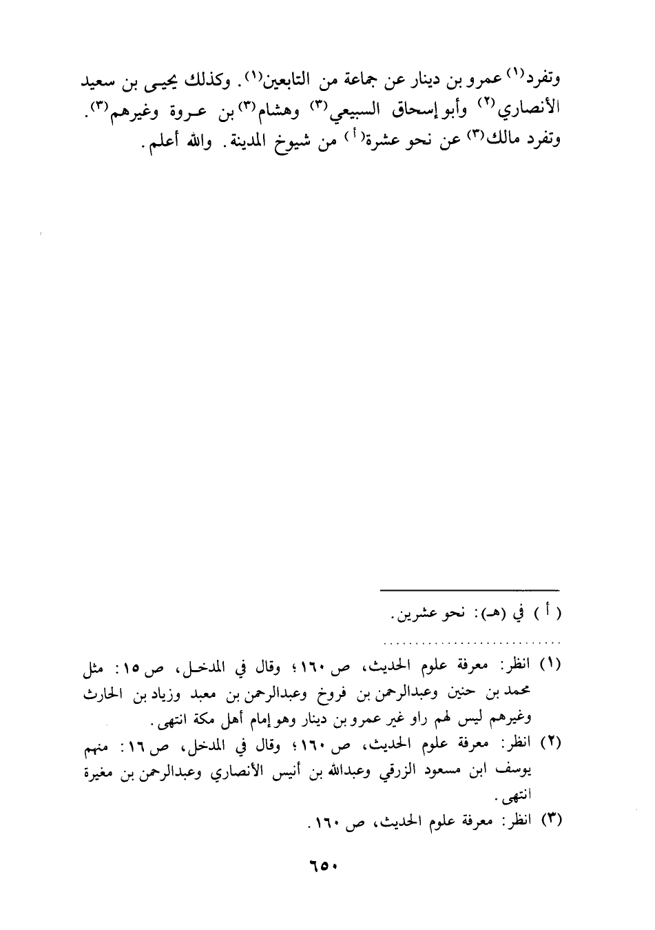 (¬1) انظر: معرفة علوم الحديث، ص 160؛ وقال في المدخل، ص 15: مثل محمد بن حنين وعبد الرحمن بن فروخ وعبد الرحمن بن معبد وزياد بن الحارث وغيرهم ليس لهم راو غير عمرو بن دينار وهو إمام أهل مكة انتهى.