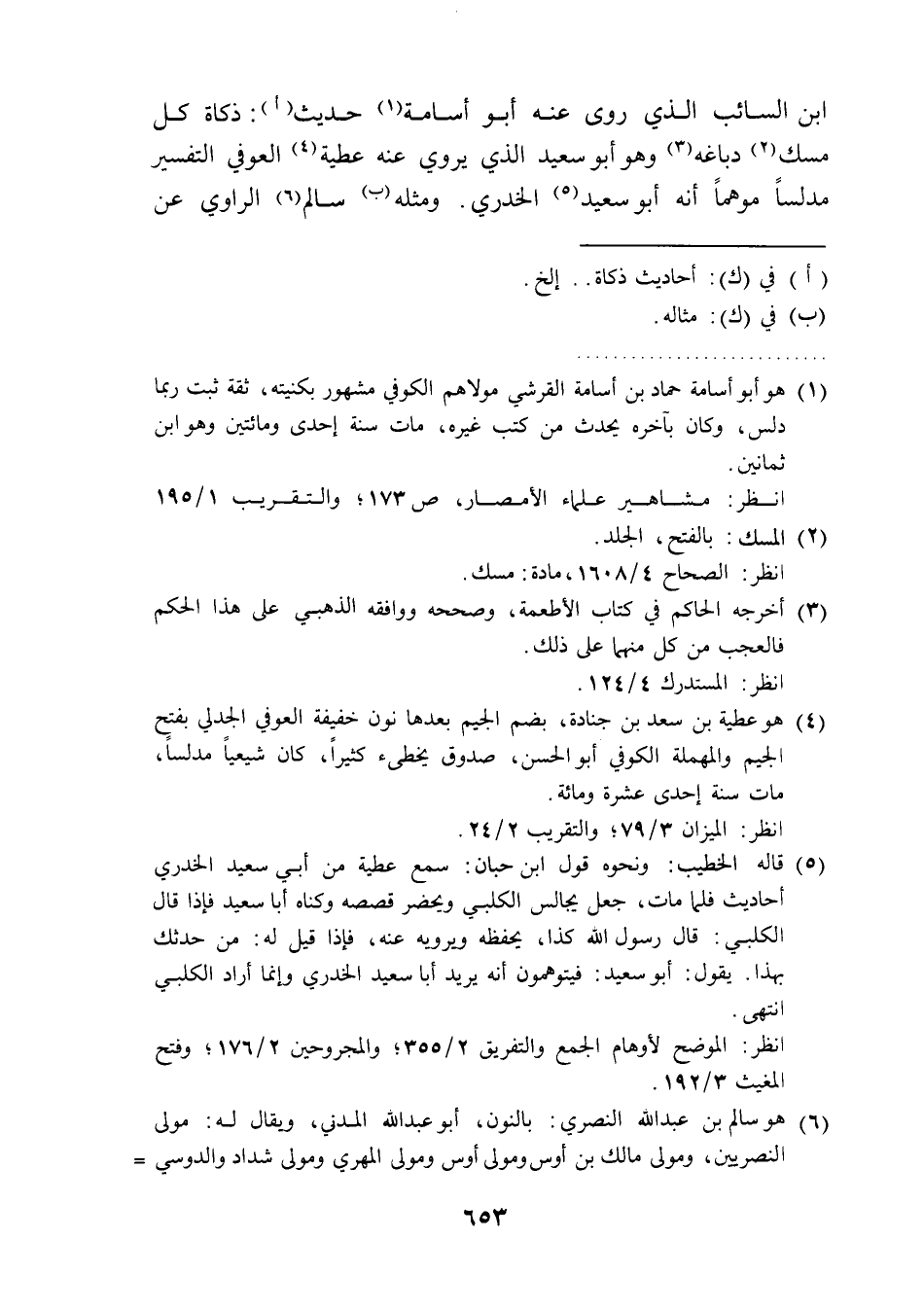 ابن السائب الذي روى عنه أبو أسامة (¬1) حديث (أ): ذكاة كل مسك (¬2) دباغه (¬3) وهو أبو سعيد الذي يروي عنه عطية (¬4) العوفي التفسير مدلسًا موهمًا أنه أبو سعيد (¬5) الخدري. ومثله (ب) سالم (¬6) الراوي عن