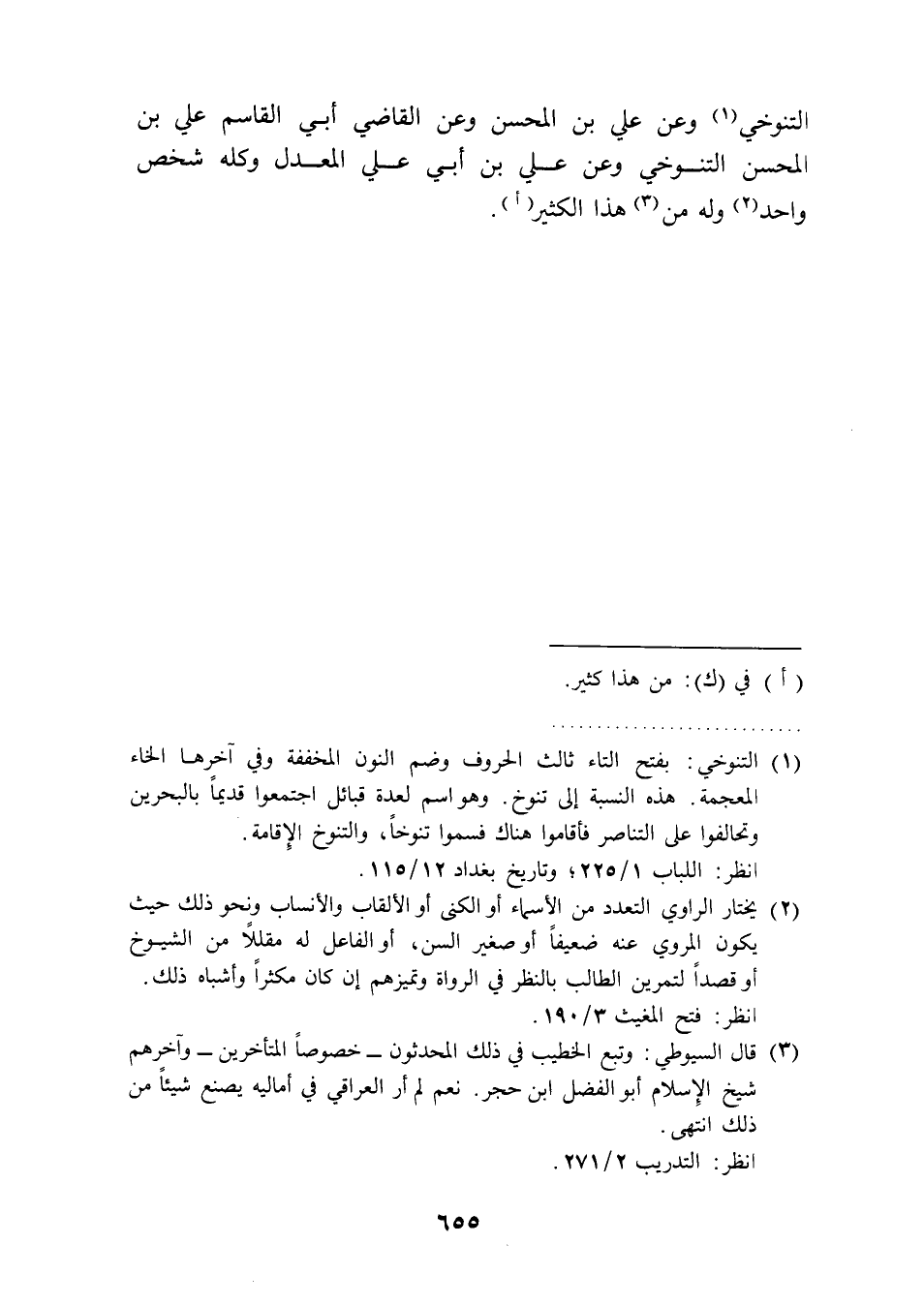 (¬1) التنوخي: بفتح التاء ثالث الحروف وضم النون المخففة وفي آخرها الخاء المعجمة. هذه النسبة إلى تنوخ. وهو اسم لعدة قبائل اجتمعوا قديمًا بالبحرين وتحالفوا على التناصر فأقاموا هناك فسموا تنوخًا، والتنوخ الإِقامة.
