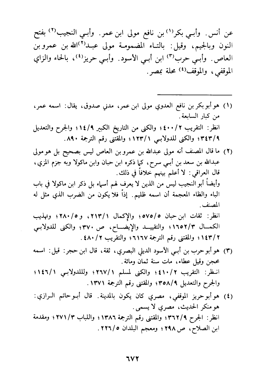 عن أنس. وأبي بكر (¬1) بن نافع مولى ابن عمر. وأبي النجيب (2) بفتح النون وبالجيم، وقيل: بالتاء المضمومة مولى عبد (¬2) الله بن عمرو بن العاص. وأبي حرب (¬3) بن أبي الأسود. وأبي حريز (4)، بالحاء والزاي الموقفي، والموقف (¬4) محلة بمصر.