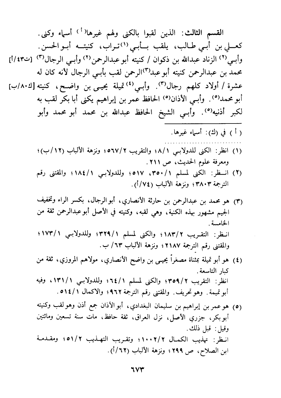 (¬1) انظر: الكنى للدولابي 1/ 8؛ والتقريب 2/ 567؛ ونزهة الألباب (12/ ب)؛ ومعرفة علوم الحديث، ص 211.