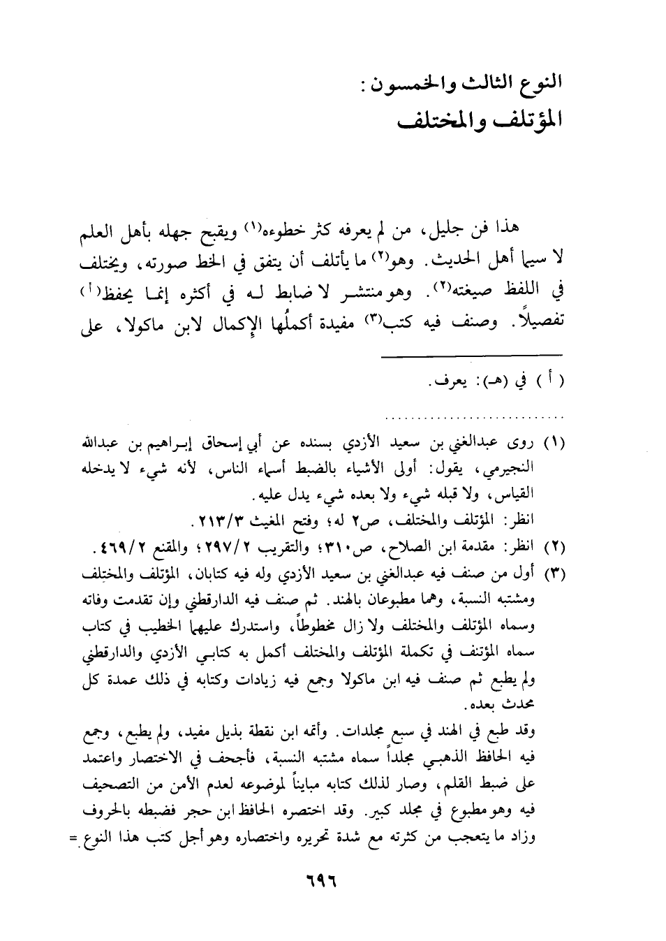 (¬3) أول من صنف فيه عبد الغني بن سعيد الأزدي وله فيه كتابان، المؤتلف والمختلف ومشتبه النسبة، وهما مطبوعان بالهند. ثم صنف فيه الدارقطني وإن تقدمت وفاته وسماه المؤتلف والمختلف ولا زال مخطوطًا، واستدرك عليهما الخطيب في كتاب سماه المؤتلف في تكملة المؤتلف والمختلف أكمل به كتابي الأزدي والدارقطني ولم يطبع ثم صنف فيه ابن ماكولا وجمع فيه زيادات وكتابه في ذلك عمدة كل محدث بعده.