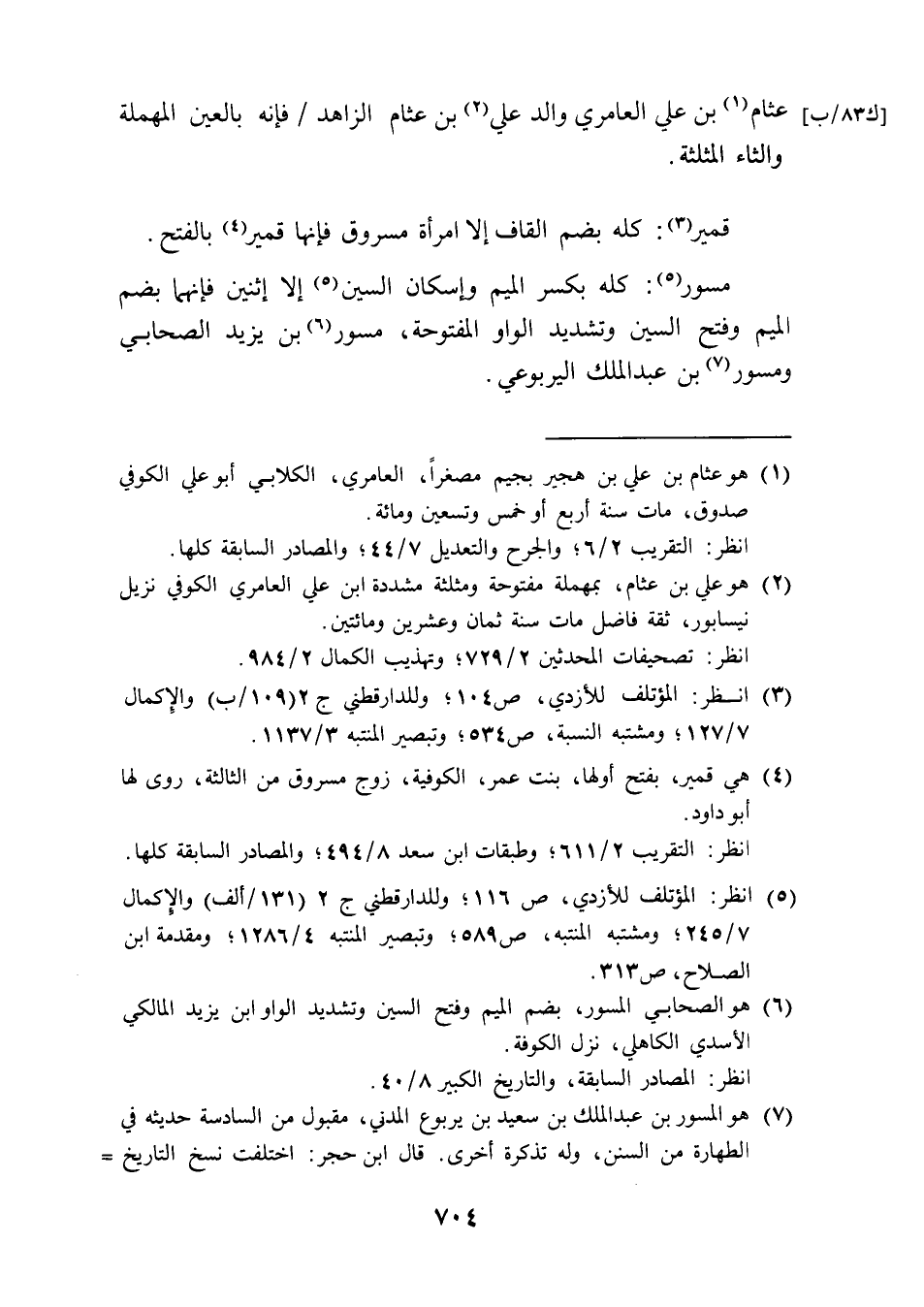 (¬5) انظر: المؤتلف للأزدي، ص 116؛ وللدارقطني ج 2 (131/ ألف) والإِكمال 7/ 245؛ ومشتبه المنتبه، ص 589؛ وتبصير المنتبه 4/ 1286؛ ومقدمة ابن الصلاح، ص 313.