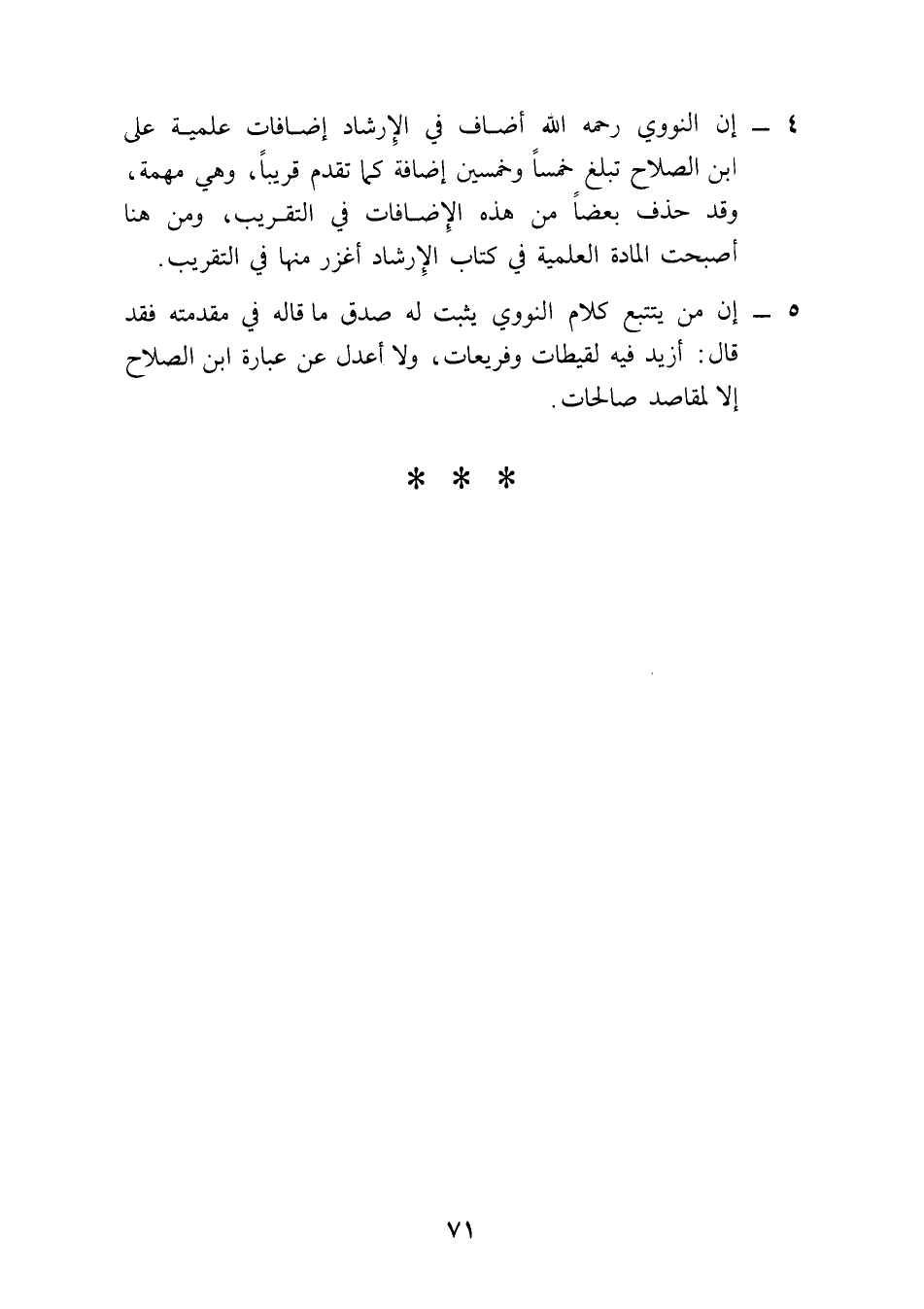 5 - إن من يتتبع كلام النووي يثبت له صدق ما قاله في مقدمته فقد قال: أزيد فيه لقيطات وفريعات، ولا أعدل عن عبارة ابن الصلاح إلا لمقاصد صالحات