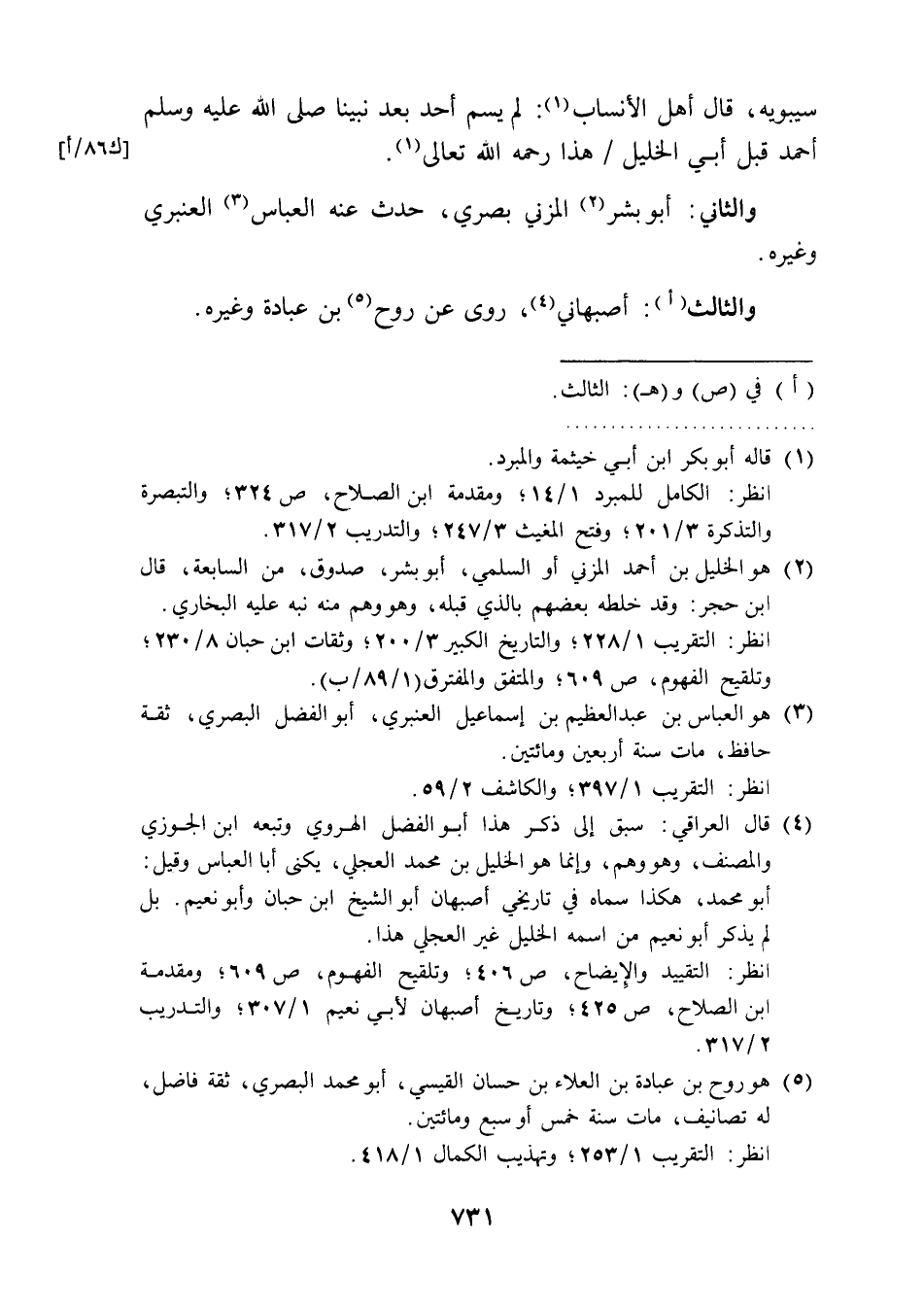 انظر: الكامل للمبرد 1/ 14؛ ومقدمة ابن الصلاح، ص 324؛ والتبصرة والتذكرة 3/ 201؛ وفتح المغيث 3/ 247؛ والتدريب 2/ 317.