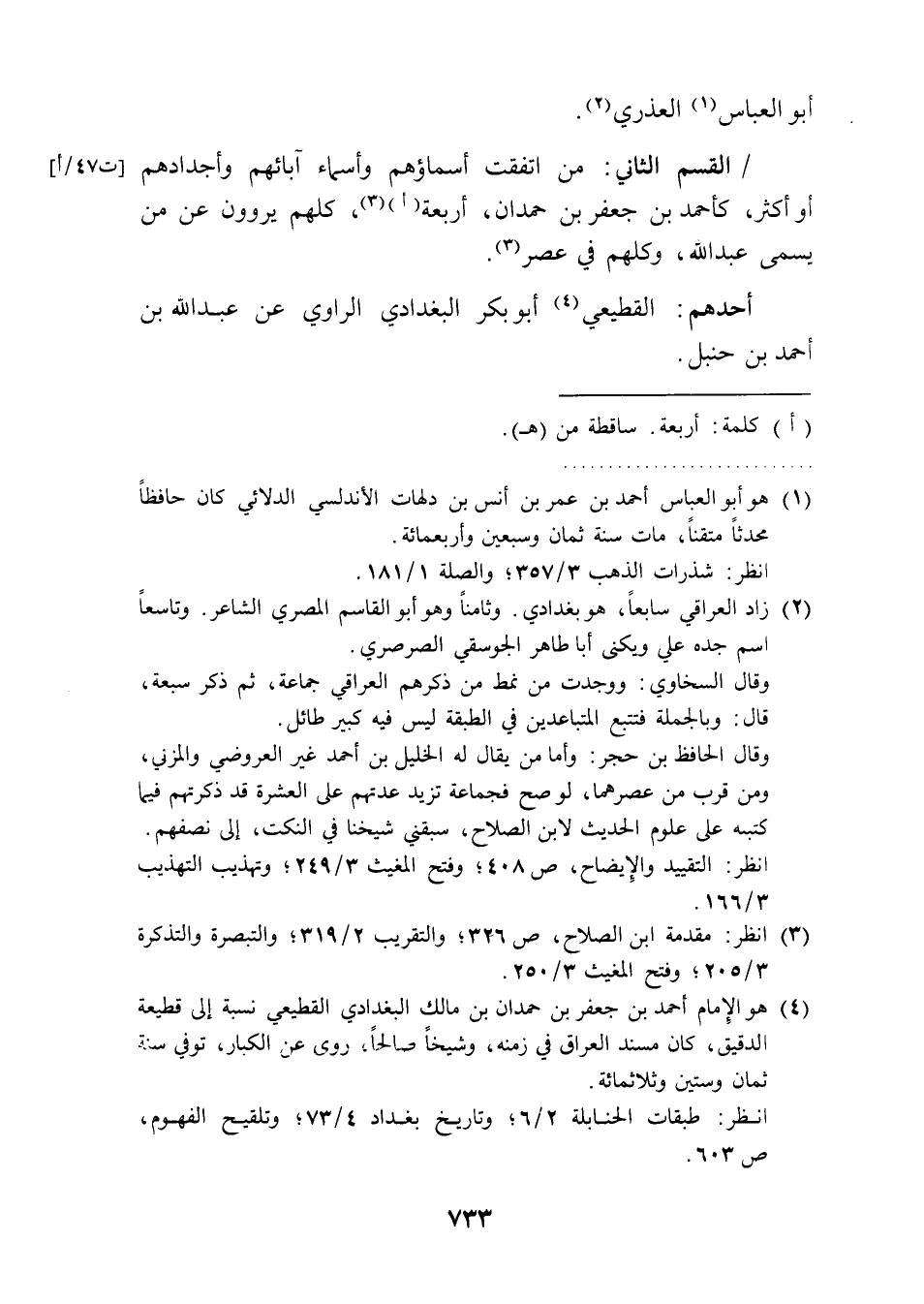 القسم الثاني: من اتفقت أسماؤهم وأسماء آبائهم وأجدادهم أو أكثر، كأحمد بن جعفر بن حمدان، أربعة (أ) (¬3)، كلهم يروون عن من يسمى عبد الله، وكلهم في عصر (3).