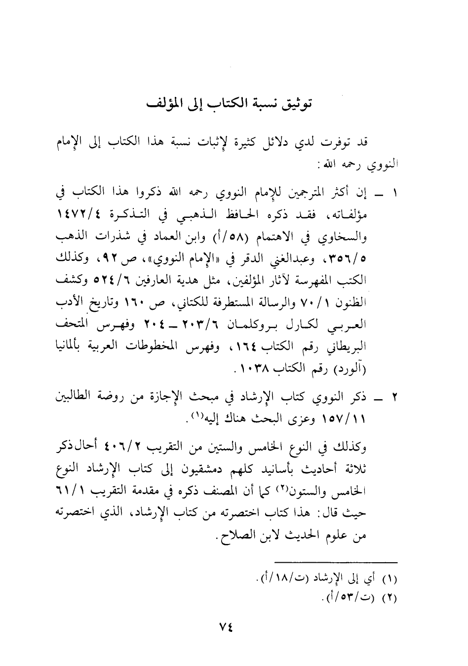 قد توفرت لدي دلائل كثيرة لإِثبات نسبة هذا الكتاب إلى الإِمام النووي رحمه الله: