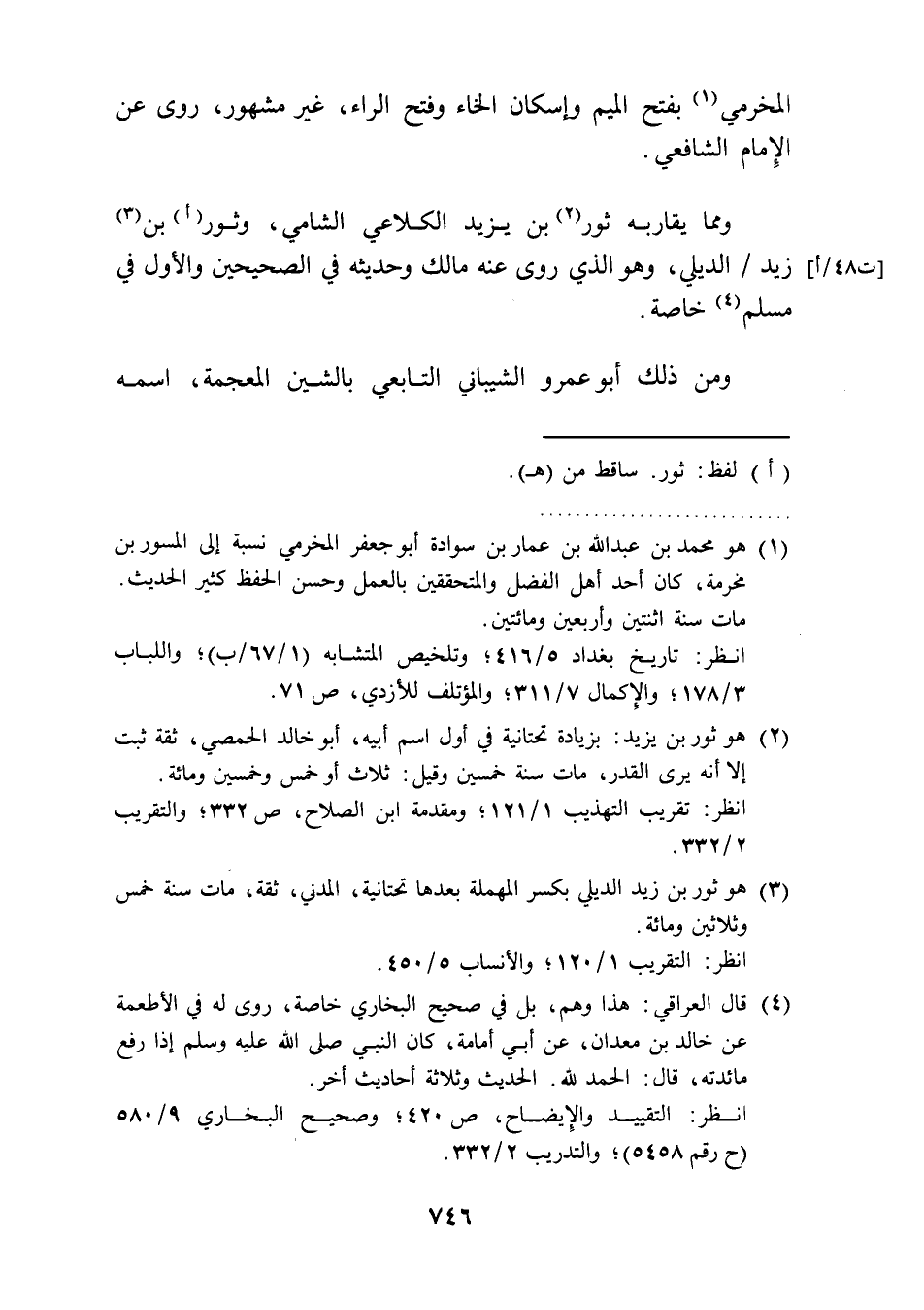 (¬2) هو ثور بن يزيد: بزيادة تحتانية في أول اسم أبيه، أبو خالد الحمصي، ثقة ثبت إلا أنه يرى القدر، مات سنة خمسين وقيل: ثلاث أو خمس وخمسين ومائة.