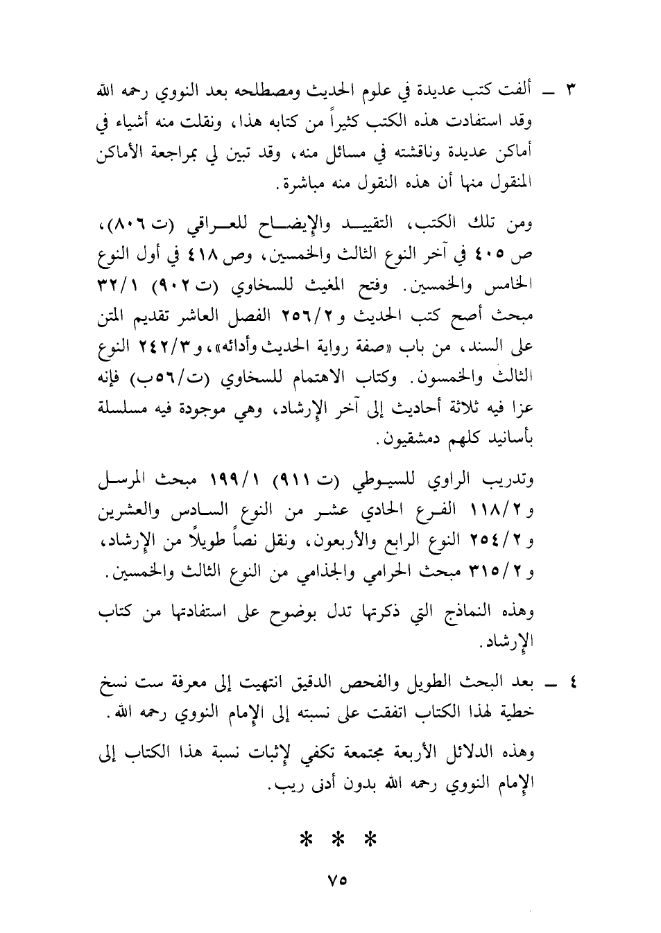 وهذه الدلائل الأربعة مجتمعة تكفي لإِثبات نسبة هذا الكتاب إلى الإِمام النووي رحمه الله بدون أدنى ريب.