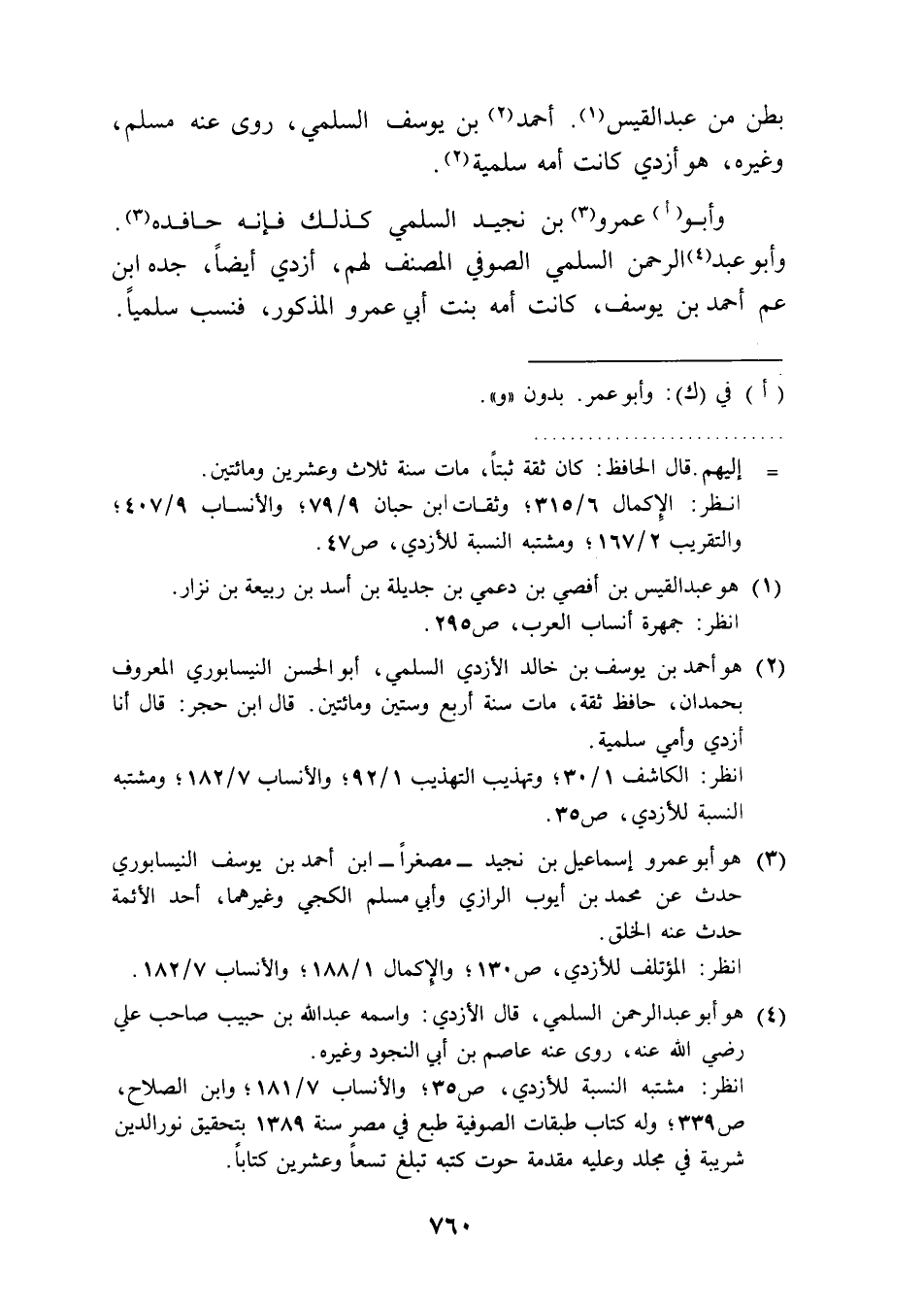 وأبو (أ) عمرو (3) بن نجيد السلمي كذلك فإنه حافده (¬3). وأبو عبد (¬4) الرحمن السلمي الصوفي المصنف لهم، أزدي أيضًا، جده ابن عم أحمد بن يوسف، كانت أمه بنت أبي عمرو المذكور، فنسب سلميًا.