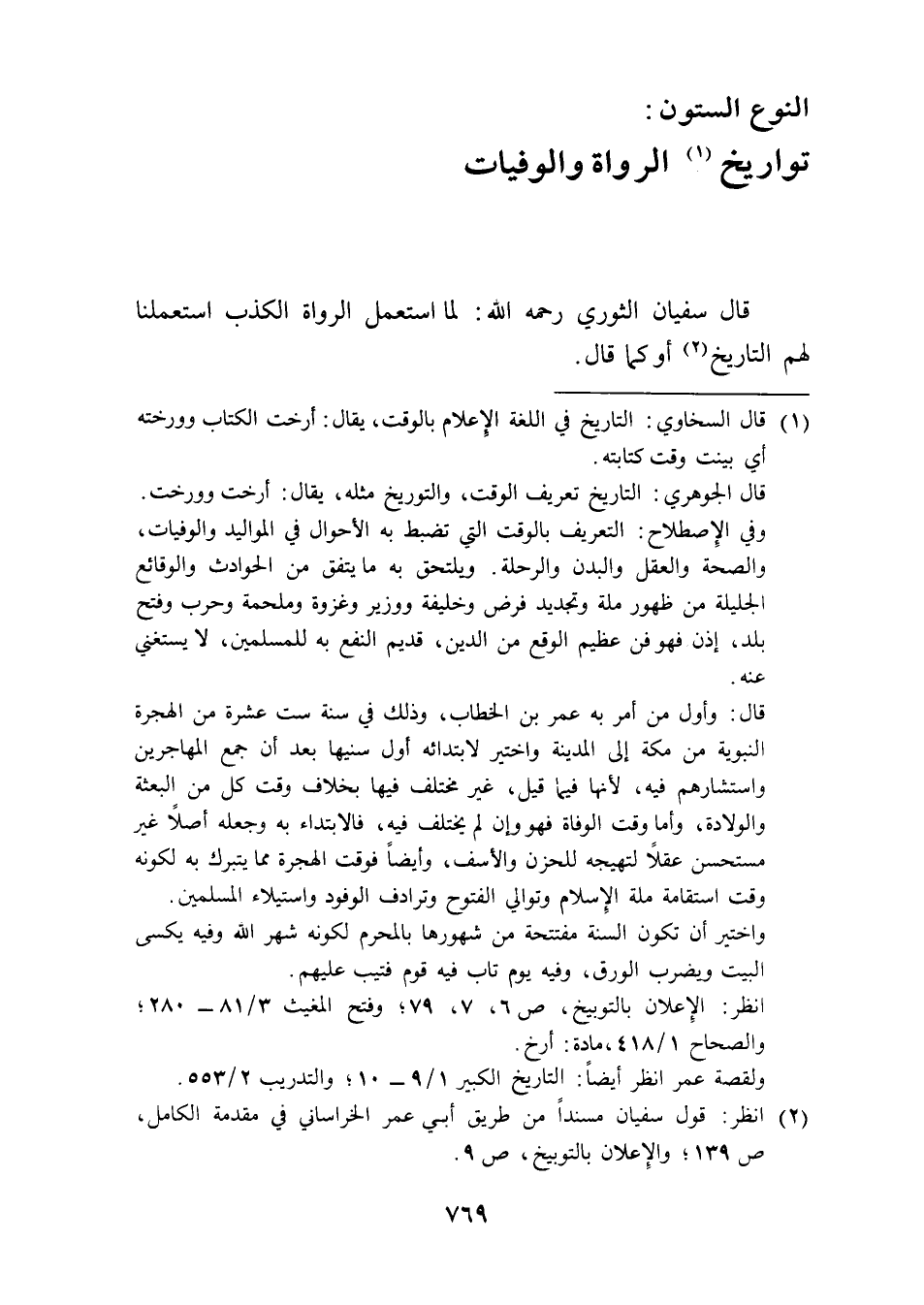 انظر: الإِعلان بالتوبيخ، ص 6، 7، 79؛ وفتح المغيث 3/ 81 - 280؛ والصحاح 1/ 418، مادة: أرخ.