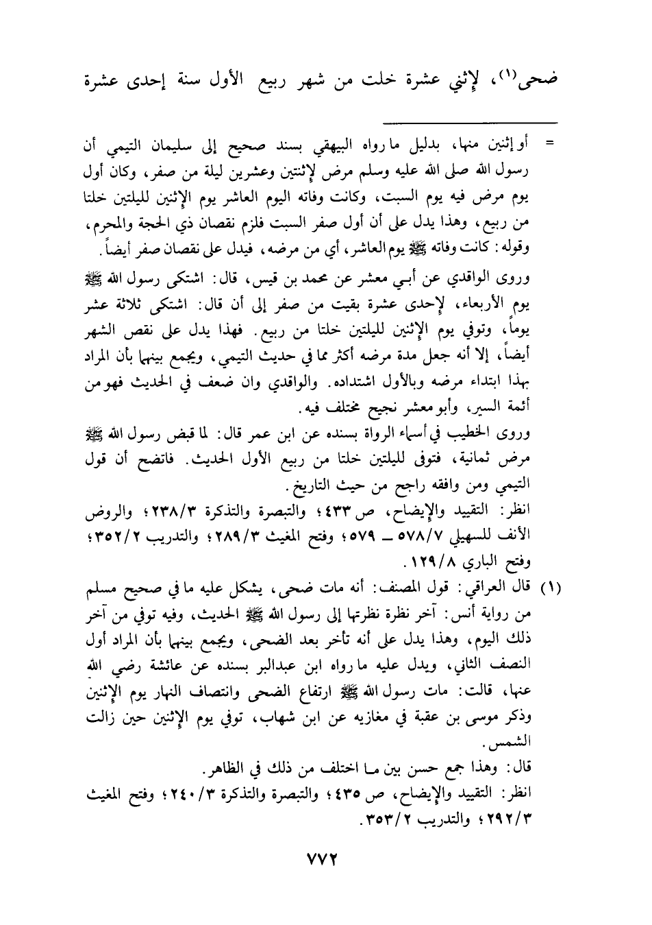 = أو إثنين منها، بدليل ما رواه البيهقي بسند صحيح إلى سليمان التيمي أن رسول الله صلى الله عليه وسلم مرض لإِثنتين وعشرين ليلة من صفر، وكان أول يوم مرض فيه يوم السبت، وكانت وفاته اليوم العاشر يوم الإِثنين لليلتين خلتا من ربيع، وهذا يدل على أن أول صفر السبت فلزم نقصان ذي الحجة والمحرم، وقوله: كانت وفاته - صلى الله عليه وسلم - يوم العاشر، أي من مرضه، فيدل على نقصان صفر أيضًا.