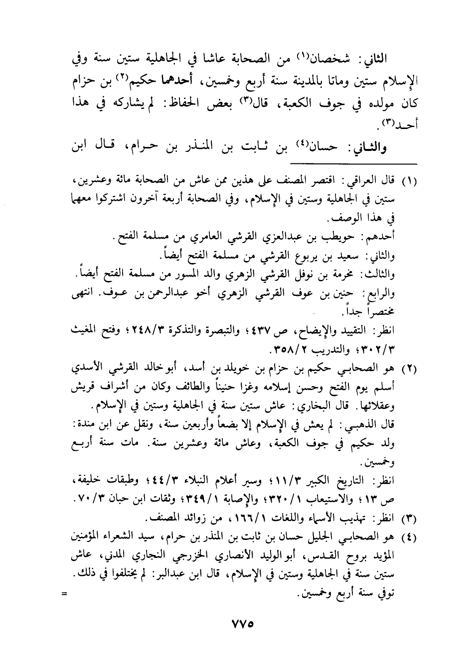 (¬1) قال العراقي: اقتصر المصنف على هذين ممن عاش من الصحابة مائة وعشرين، ستين في الجاهلية وستين في الإِسلام، وفي الصحابة أربعة آخرون اشتركوا معهما في هذا الوصف.