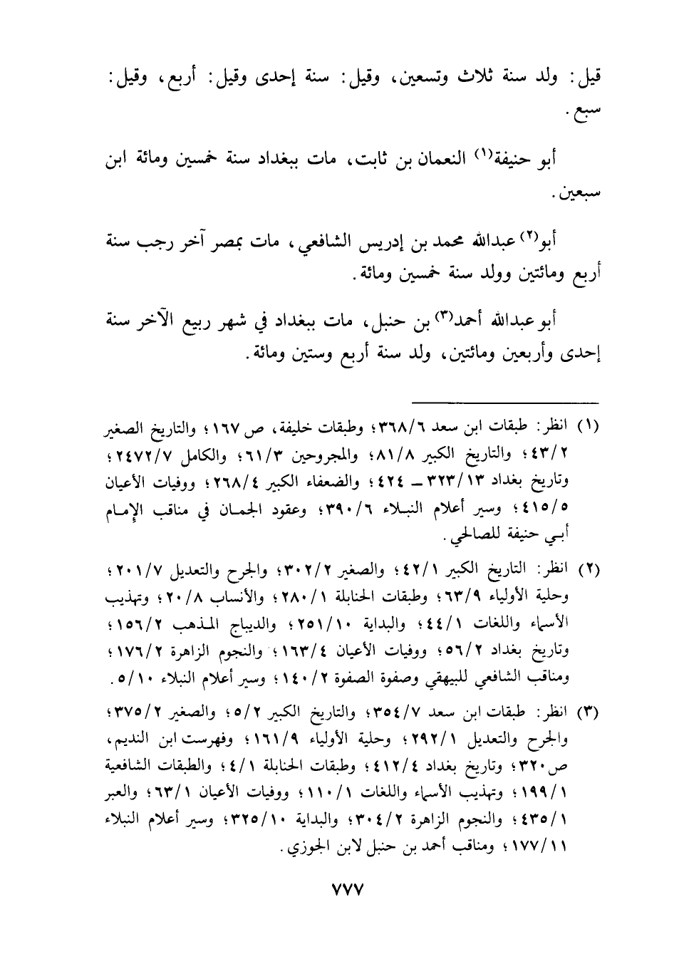 (¬3) انظر: طبقات ابن سعد 7/ 354؛ والتاريخ الكبير 2/ 5؛ والصغير 2/ 375؛ والجرح والتعديل 1/ 292؛ وحلية الأولياء 9/ 161؛ وفهرست ابن النديم، ص 320؛ وتاريخ بغداد 4/ 412؛ وطبقات الحنابلة 1/ 4؛ والطبقات الشافعية 1/ 199؛ وتهذيب الأسماء واللغات 1/ 110؛ ووفيات الأعيان 1/ 63؛ والعبر 1/ 435؛ والنجوم الزاهرة 2/ 304؛ والبداية 10/ 325؛ وسير أعلام النبلاء 11/ 177؛ ومناقب أحمد بن حنبل لابن الجوزي.
