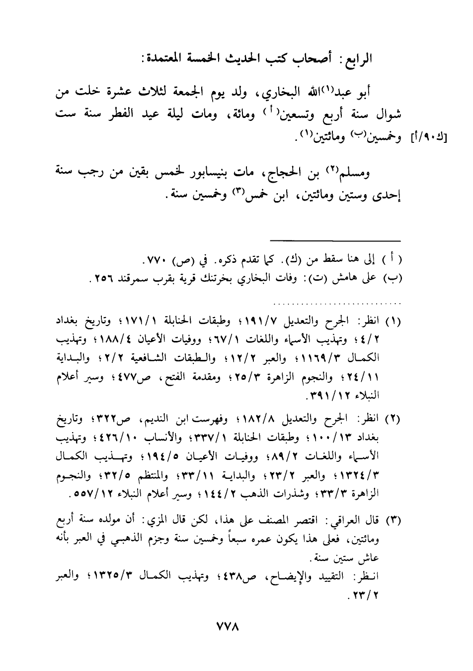(¬3) قال العراقي: اقتصر المصنف على هذا، لكن قال المزي: أن مولده سنة أربع ومائتين، فعلى هذا يكون عمره سبعًا وخمسين سنة وجزم الذهبي في العبر بأنه عاش ستين سنة.
