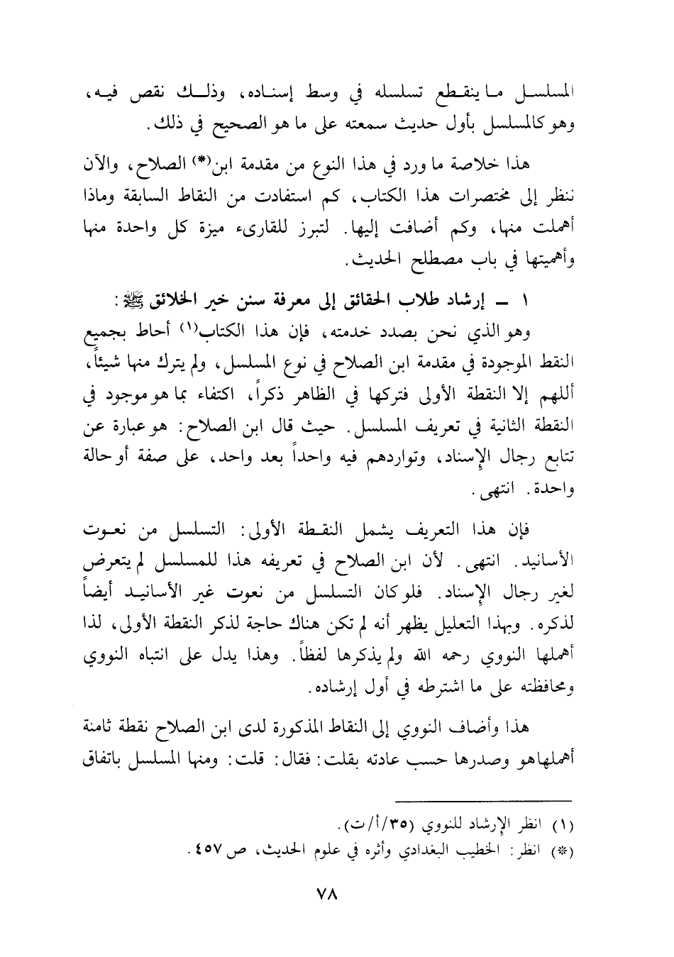 فإن هذا التعريف يشمل النقطة الأولى: التسلسل من نعوت الأسانيد. انتهى. لأن ابن الصلاح في تعريفه هذا للمسلسل لم يتعرض لغيره رجال الإِسناد. فلو كان التسلسل من نعوت غير الأسانيد أيضًا لذكره. وبهذا التعليل يظهر أنه لم تكن هناك حاجة لذكر النقطة الأولى، لذا أهملها النووي رحمه الله ولم يذكرها لفظًا. وهذا يدل على انتباه النووي ومحافظته على ما اشترطه في أول إرشاده.