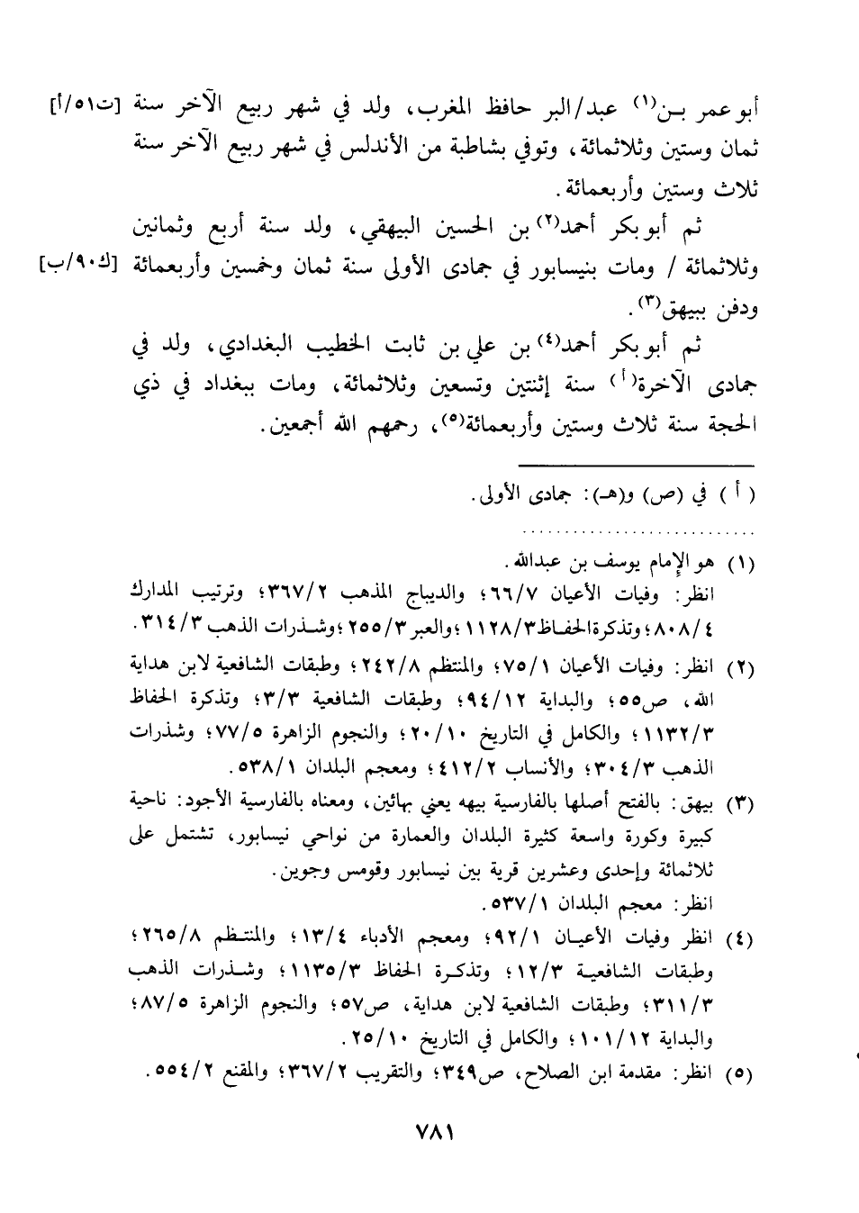 (¬4) انظر وفيات الأعيان 1/ 92؛ ومعجم الأدباء 4/ 13؛ والمنتظم 8/ 265؛ وطبقات الشافعية 3/ 12؛ وتذكرة الحفاظ 3/ 1135؛ وشذرات الذهب 3/ 311؛ وطبقات الشافعية لابن هداية، ص 57؛ والنجوم الزاهرة 5/ 87؛ والبداية 12/ 101؛ والكامل في التاريخ 10/ 25.