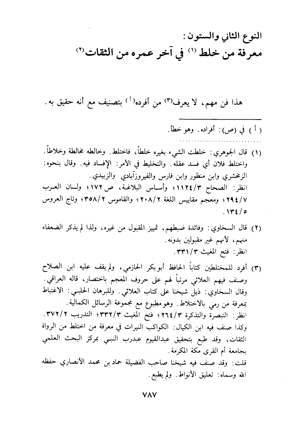 (¬3) أفرد للمختلطين كتابًا الحافظ أبو بكر الحازمي، ولم يقف عليه ابن الصلاح وصنف فيهم العلائي مرتبًا لهم على حروف المعجم باختصار، قاله العراقي. وقال السخاوي: ذيل شيخنا على كتاب العلائي. وللبرهان الحلبي: الاغتباط بمعرفة من رمي بالاختلاط. وهو مطبوع مع مجموعة الرسائل الكمالية.