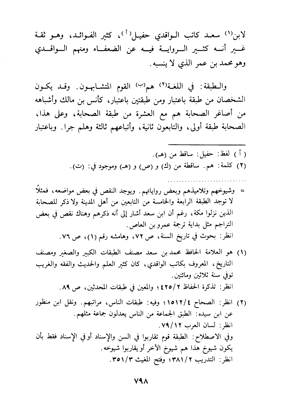 والطبقة: في اللغة (¬2) هم (ب) القوم المتشابهون. وقد يكون الشخصان من طبقة باعتبار ومن طبقتين باعتبار، كأنس بن مالك وأشباهه من أصاغر الصحابة هم مع العشرة من طبقة الصحابة، وعلى هذا، الصحابة طبقة أولى، والتابعون ثانية، وأتباعهم ثالثة وهلم جرا. وباعتبار