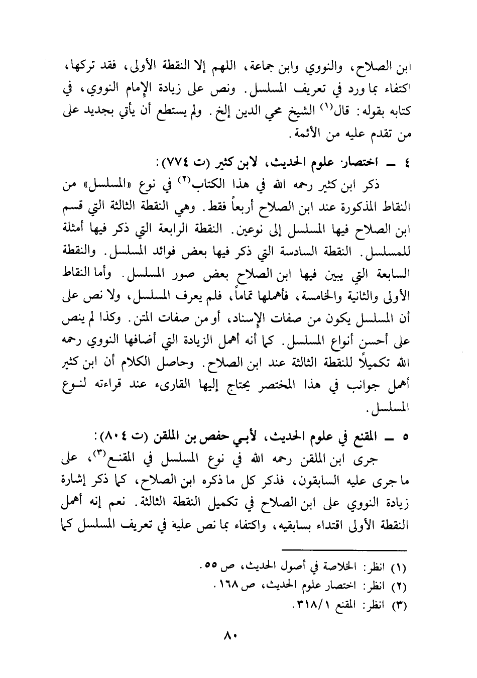ابن الصلاح، والنووي وابن جماعة، اللهم إلا النقطة الأولى، فقد تركها، اكتفاء بما ورد في تعريف المسلسل. ونص على زيادة الإِمام النووي، في كتابه بقوله: قال (¬1) الشيخ محي الدين إلخ. ولم يستطع أن يأتي بجديد على من تقدم عليه من الأئمة.