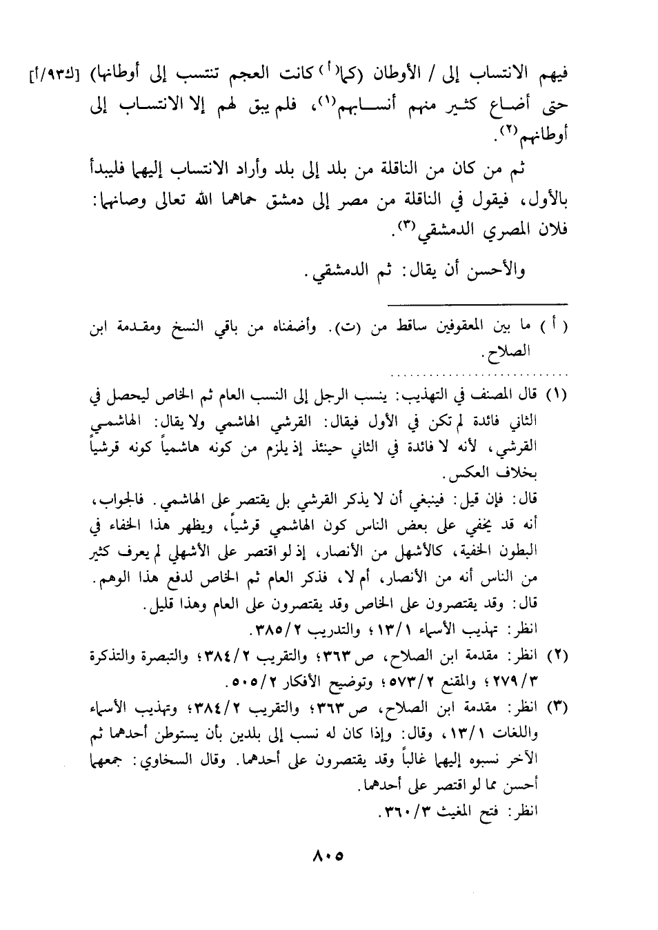 (¬3) انظر: مقدمة ابن الصلاح، ص 363؛ والتقريب 2/ 384؛ وتهذيب الأسماء واللغات 1/ 13، وقال: وإذا كان له نسب إلى بلدين بأن يستوطن أحدهما ثم الآخر نسبوه إليهما غالبًا وقد يقتصرون على أحدهما. وقال السخاوي: جمعهما أحسن مما لو اقتصر على أحدهما.