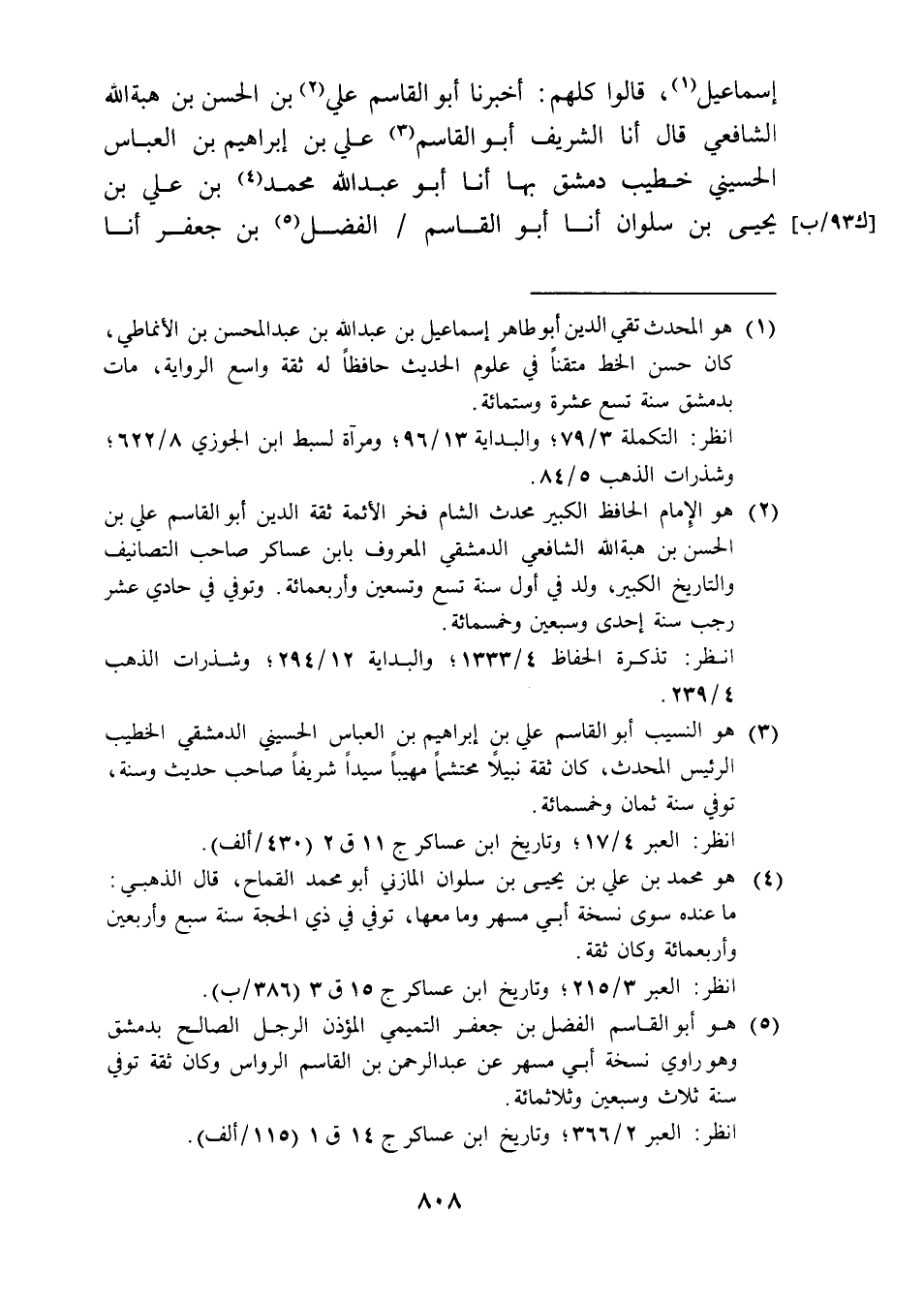 (¬3) هو النسيب أبو القاسم علي بن إبراهيم بن العباس الحسيني الدمشقي الخطيب الرئيس المحدث، كان ثقة نبيلًا محتشمًا مهيبًا سيدًا شريفًا صاحب حديث وسنة، توفي سنة ثمان وخمسمائة.