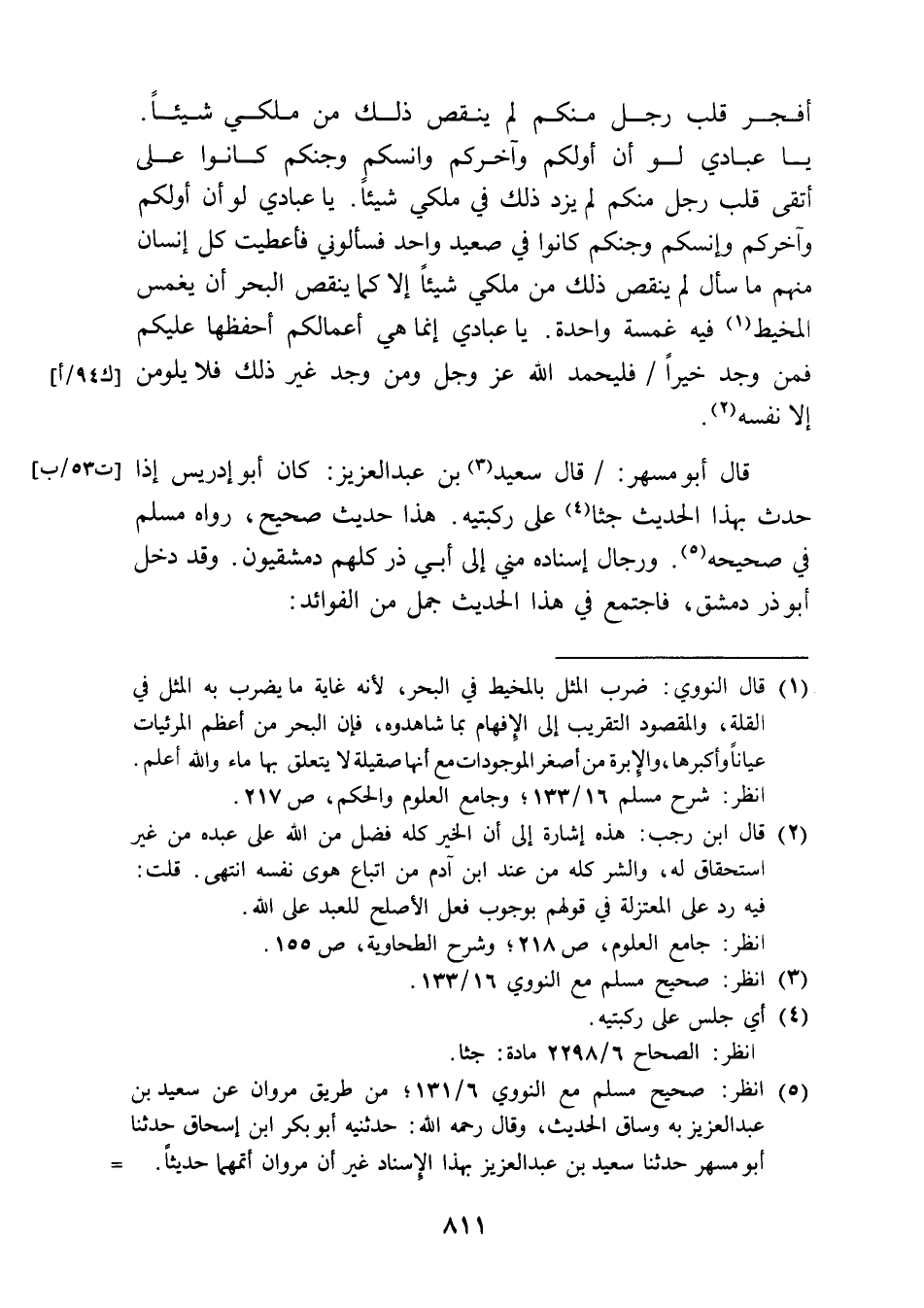 قال أبو مسهر: قال سعيد (¬3) بن عبد العزيز: كان أبو إدريس إذا حدث بهذا الحديث جثا (¬4) على ركبتيه. هذا حديث صحيح، رواه مسلم في صحيحه (¬5). ورجال إسناده مني إلى أبي ذر كلهم دمشقيون. وقد دخل أبو ذر دمشق، فاجتمع في هذا الحديث جمل من الفوائد: