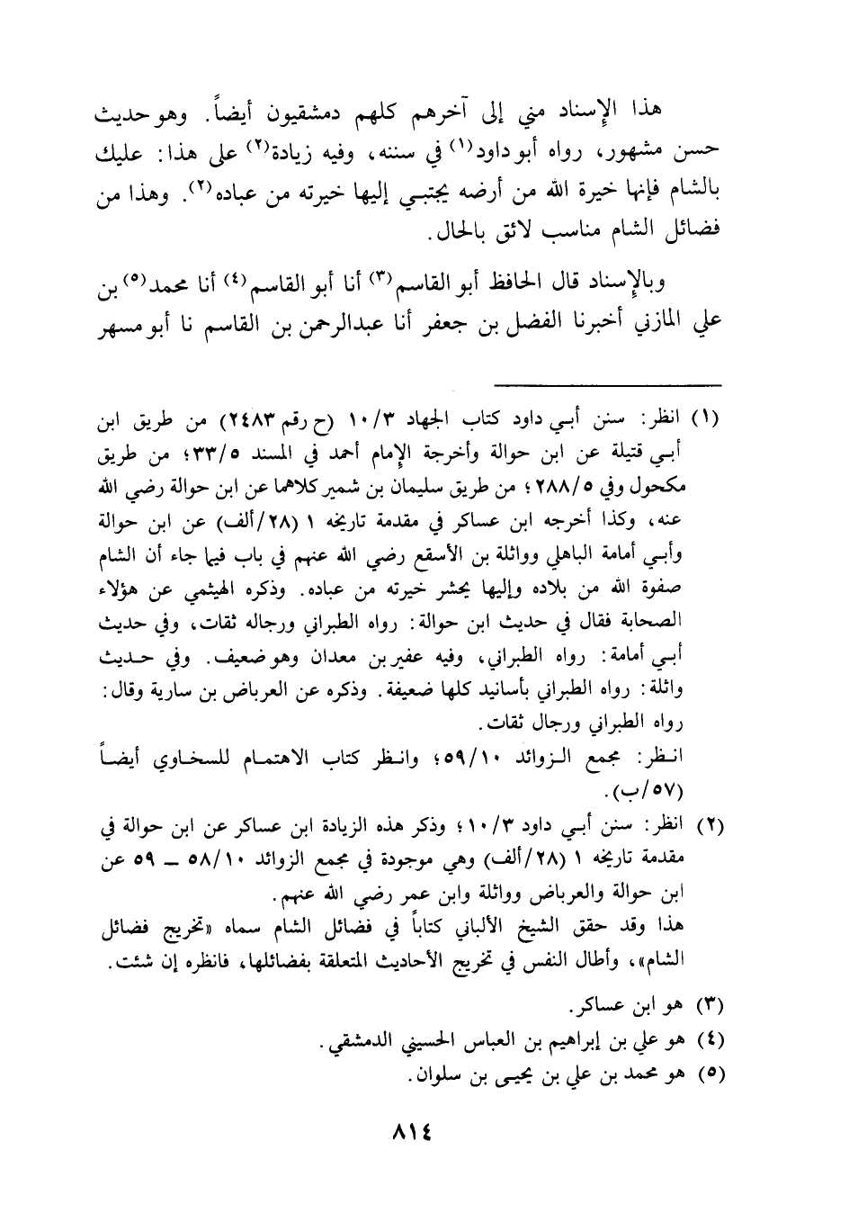هذا الإِسناد مني إلى آخرهم كلهم دمشقيون أيضًا. وهو حديث حسن مشهور، رواه أبو داود (¬1) في سننه، وفيه زيادة (¬2) على هذا: عليك بالشام فإنها خيرة الله من أرضه يجتبي إليها خيرته من عباده (2). وهذا من فضائل الشام مناسب لائق بالحال.