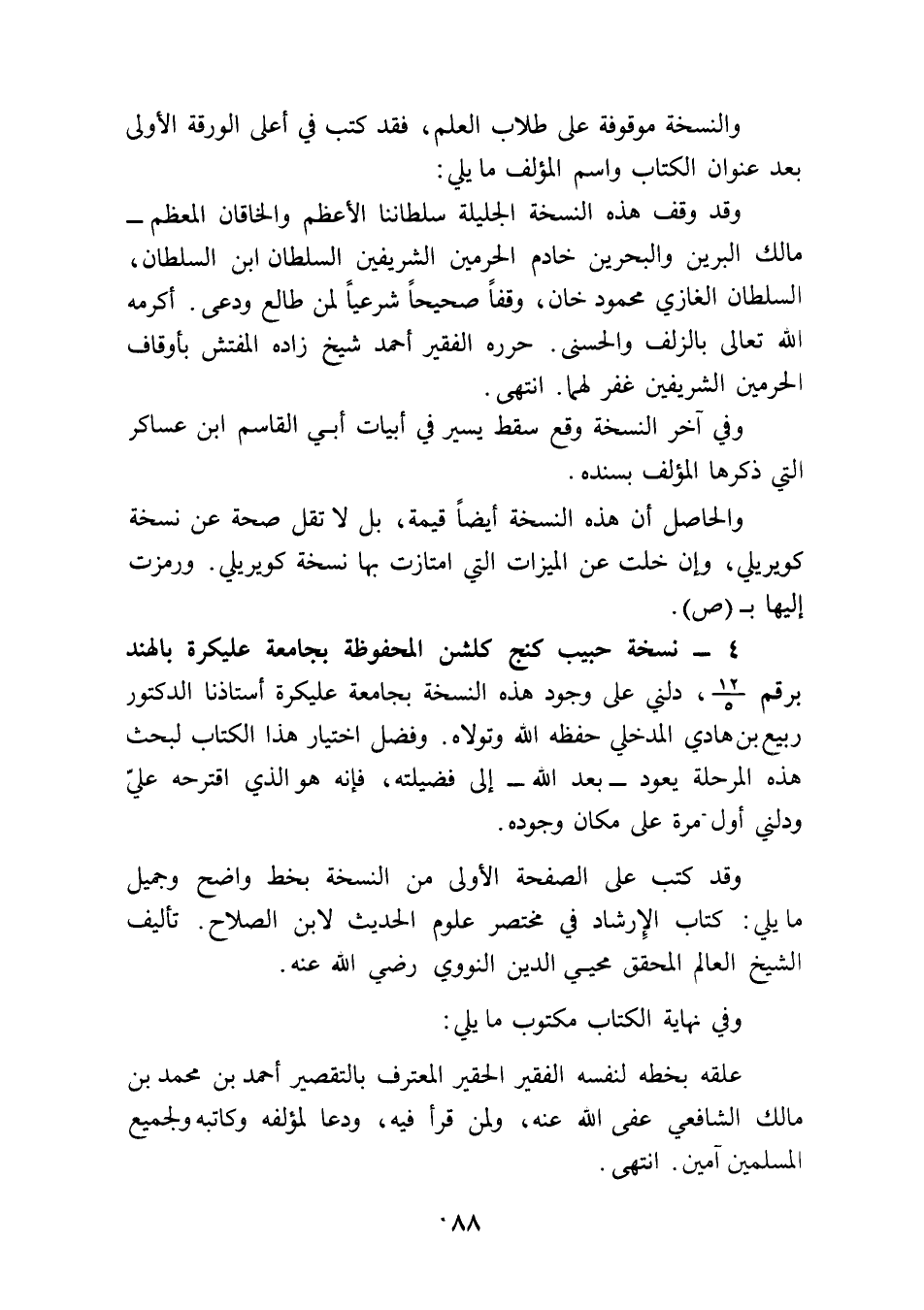 وقد كتب على الصفحة الأولى من النسخة بخط واضح وجميل ما يلي: كتاب الإِرشاد في مختصر علوم الحديث لابن الصلاح. تأليف الشيخ العالم المحقق محيي الدين النووي رضي الله عنه.