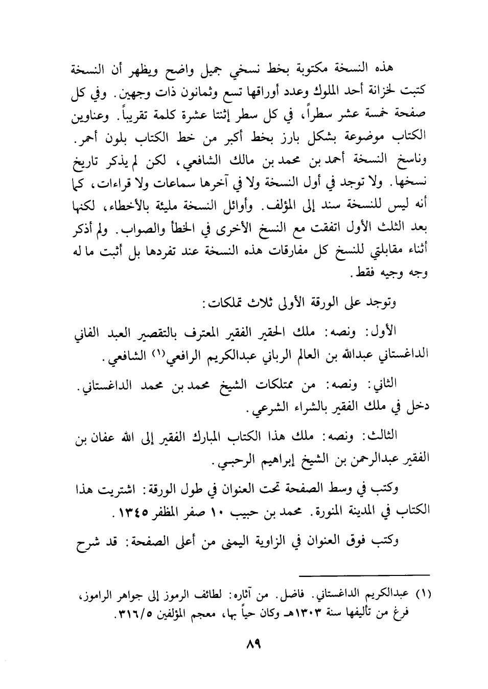 الأول: ونصه: ملك الحقير الفقير المعترف بالتقصير العبد الفاني الداغستاني عبد الله بن العالم الرباني عبد الكريم الرافعي (¬1) الشافعي.