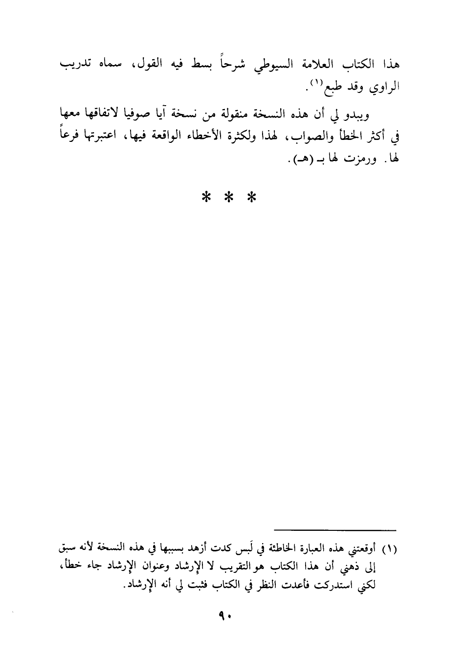 (¬1) أوقعتني هذه العبارة الخاطئة في لَبس كدت أزهد بسببها في هذه النسخة لأنه سبق إلى ذهني أن هذا الكتاب هو التقريب لا الإِرشاد وعنوان الإرشاد جاء خطأ، لكني استدركت فأعدت النظر في الكتاب فثبت لي أنه الإِرشاد.