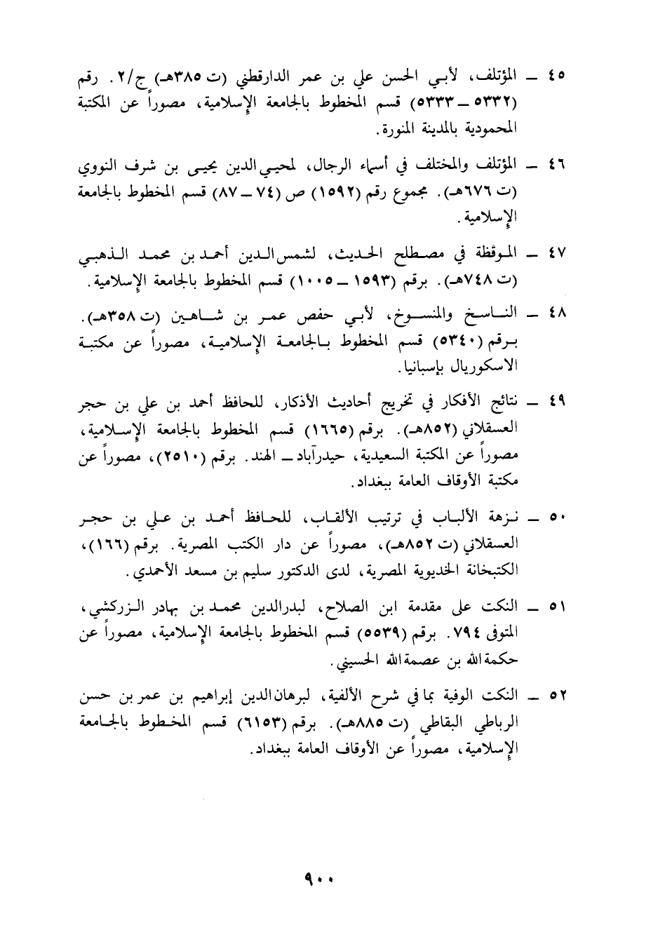49 - نتائج الأفكار في تخريج أحاديث الأذكار، للحافظ أحمد بن علي بن حجر العسقلاني (852 هـ). برقم (1665) قسم المخطوط بالجامعة الإِسلامية، مصورًا عن المكتبة السعيدية، حيدرآباد - الهند. برقم (2510)، مصورًا عن مكتبة الأوقاف العامة ببغداد.