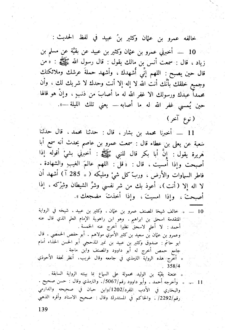 10 - أَخْبرنِي عَمْرو بن عُثْمَان وَكثير بن عبيد عَن بَقِيَّة عَن مُسلم بن زِيَاد قَالَ سَمِعت أنس بن مَالك يَقُول قَالَ رَسُول الله صلى الله عَلَيْهِ وَسلم من قَالَ حِين يصبح اللَّهُمَّ إِنِّي أشهدك وأشهدُ حَملَة عرشك وملائكتك وَجَمِيع خلقك بأنك أَنْت الله لَا إِلَه إِلَّا أَنْت وَحدك لَا شريك لَك وَأَن مُحَمَّدًا عَبدك وَرَسُولك إِلَّا غفر الله لَهُ مَا أصَاب من ذَنْب وَإِن هُوَ قَالَهَا حِين يُمْسِي غفر الله لَهُ مَا أَصَابَهُ يَعْنِي تِلْكَ اللية