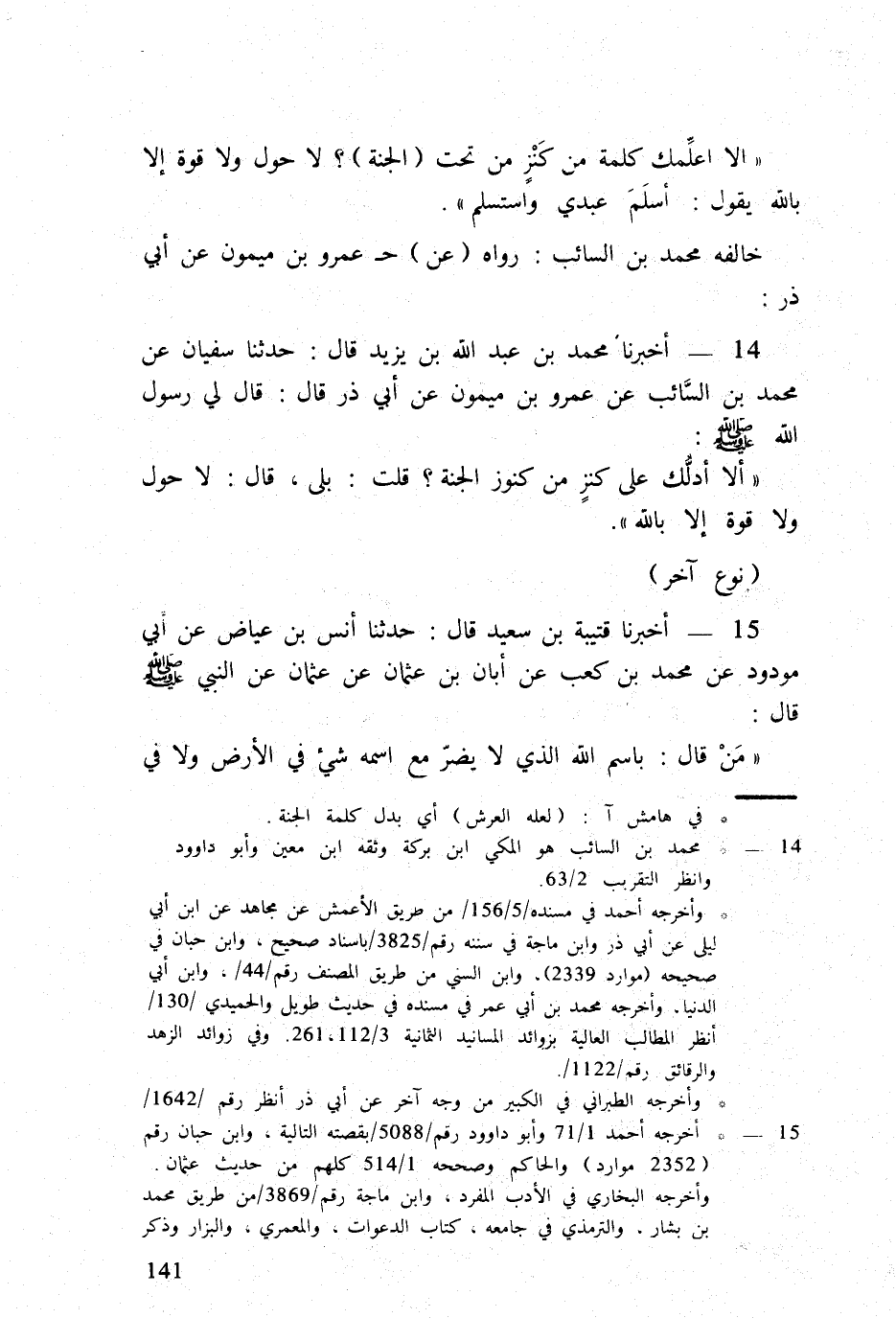 14 - أخبرنَا مُحَمَّد بن عبد الله بن يزِيد قَالَ حَدثنَا سُفْيَان عَن مُحَمَّد بن السَّائِب عَن عَمْرو بن مَيْمُون عَن أبي ذَر قَالَ قَالَ لي رَسُول الله صلى الله عَلَيْهِ وَسلم أَلا أدلك على كنز من كنوز الْجنَّة قلت بلَى قَالَ لَا حول وَلَا قُوَّة إِلَّا بِاللَّه