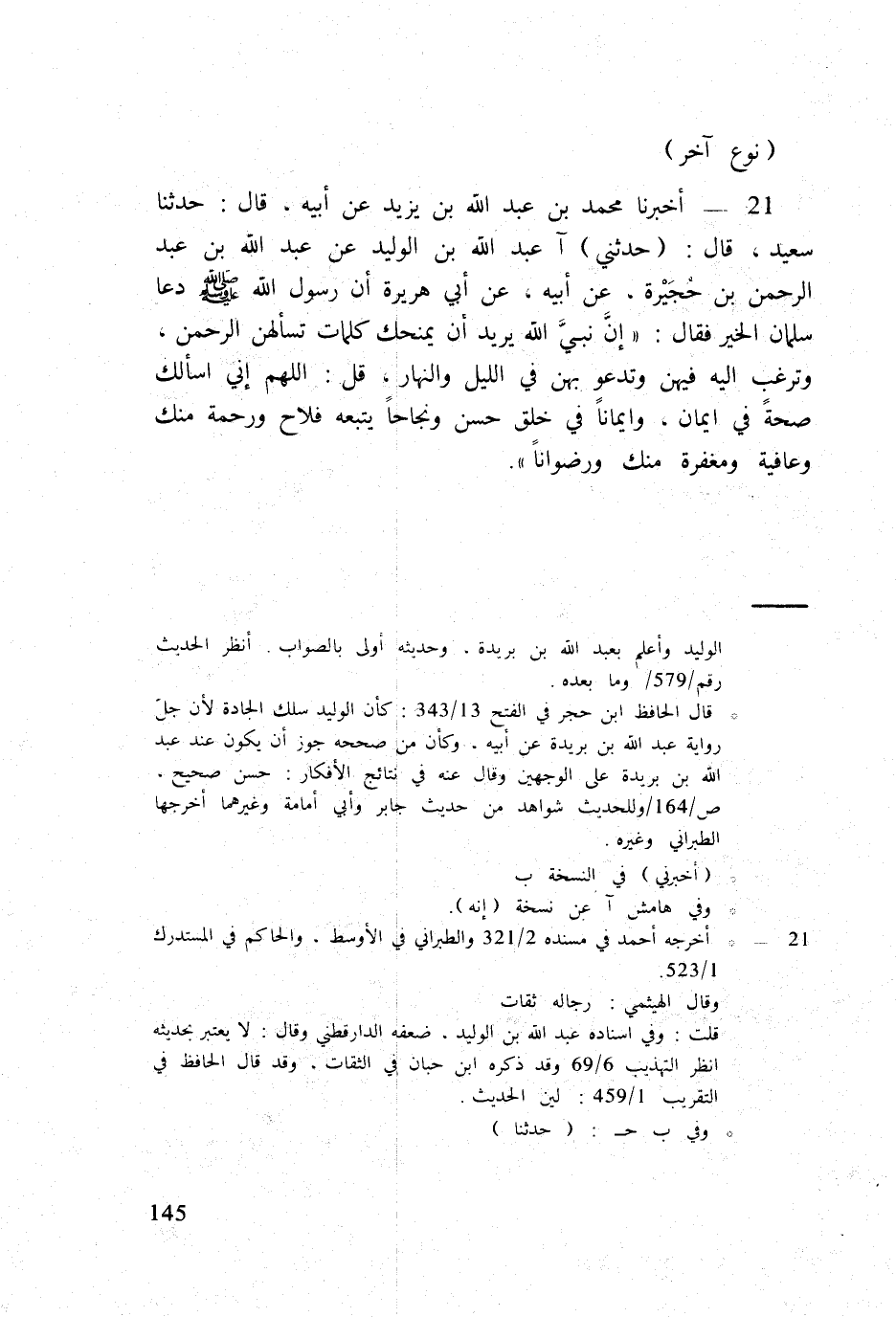 21 - أخبرنَا مُحَمَّد بن عبد الله بن يزِيد عَن أَبِيه قَالَ حَدثنَا سعيد قَالَ (حَدثنِي) آعبد الله بن الْوَلِيد عَن عبد الله بن عبد الرَّحْمَن بن حجيرة عَن أَبِيه عَن أبي هُرَيْرَة أَن رَسُول الله صلى الله عَلَيْهِ وَسلم دَعَا سلمَان الْخَيْر فَقَالَ إِن نَبِي الله يُرِيد أَن يمنحك كَلِمَات تسألهن الرَّحْمَن وترغب إِلَيْهِ فِيهِنَّ وَتَدْعُو بِهن فِي اللَّيْل وَالنَّهَار قل اللَّهُمَّ إِنِّي أَسأَلك صِحَة فِي إِيمَان وإيمانا فِي خلق حسن ونجاحا يتبعهُ فلاح وَرَحْمَة مِنْك وعافية ومغفرة مِنْك ورضوانا (نوع آخر)