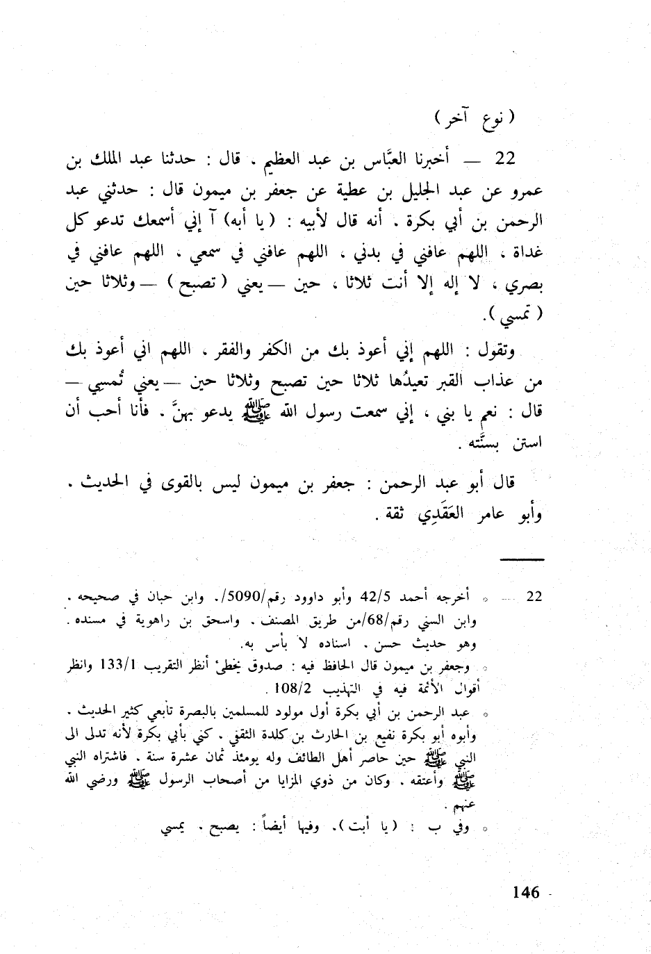 22 - أخبرنَا الْعَبَّاس بن عبد الْعَظِيم قَالَ حَدثنَا عبد الْملك بن عَمْرو عَن عبد الْجَلِيل بن عَطِيَّة عَن جَعْفَر بن مَيْمُون قَالَ حَدثنِي عبد الرَّحْمَن بن أبي بكرَة أَنه قَالَ لِأَبِيهِ (يَا أبه) آإني أسمعك تَدْعُو كل غَدَاة اللَّهُمَّ عَافنِي فِي بدني اللَّهُمَّ عَافنِي فِي سَمْعِي اللَّهُمَّ عَافنِي فِي بَصرِي لَا إِلَه إِلَّا أَنْت ثَلَاثًا حِين يَعْنِي (تصبح) وَثَلَاثًا حِين (تمسي)