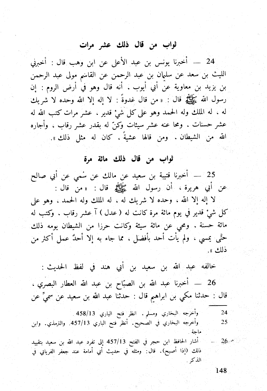 26 - أخبرنَا عبد الله بن الصَّباح بن عبد الله الْعَطَّار الْبَصْرِيّ قَالَ حدثنامكي بن إِبْرَاهِيم قَالَ حَدثنَا عبد الله بن سعيد عَن سمي عَن أبي صَالح أَنه سمع أَبَا هُرَيْرَة قَالَ قَالَ رَسُول الله صلى الله عَلَيْهِ وَسلم من قَالَ لَا إِلَه إِلَّا الله وَحده لَا شريك لَهُ لَهُ الْملك وَله الْحَمد وَهُوَ على كل شَيْء قدير عشرمرار حِين يصبح كتب لَهُ بهَا مائَة حَسَنَة ومحي عَنهُ بهَا مائَة سَيِّئَة وَكَانَت عدل رَقَبَة وَحفظ بهَا يَوْمه حَتَّى يُمْسِي وَمن قَالَهَا مثل ذَلِك حِين يُمْسِي كَانَ لَهُ مثل ذَلِك