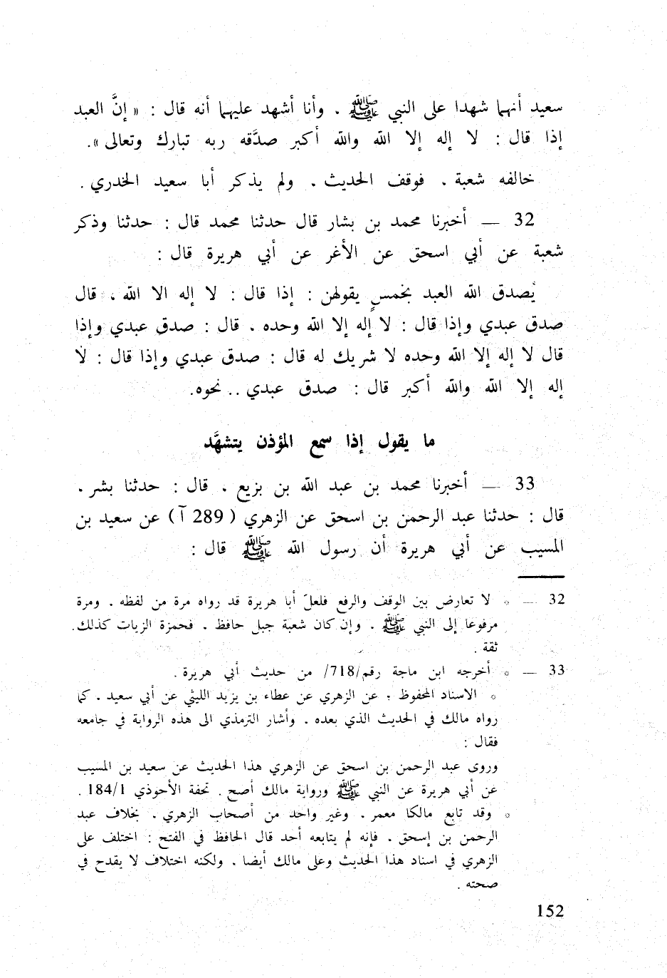 33 - أخبرنَا مُحَمَّد بن عبد الله بن بزيع قَالَ حَدثنَا بشر قَالَ حَدثنَا عبد الرَّحْمَن بن اسحق عَن الزُّهْرِيّ (289 آ) عَن سعيد بن الْمسيب عَن أبي هُرَيْرَة أَن رَسُول الله صلى الله عَلَيْهِ وَسلم قَالَ إِذا سمع أحدكُم الْمُؤَذّن يتَشَهَّد فَقولُوا مثل قَوْله